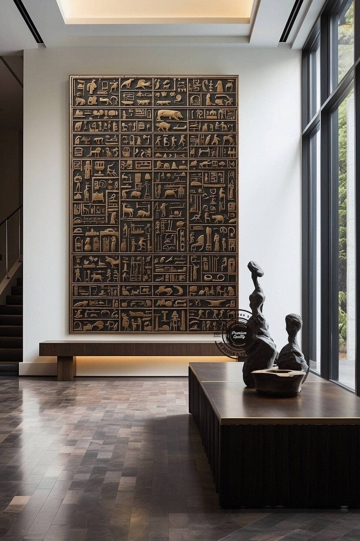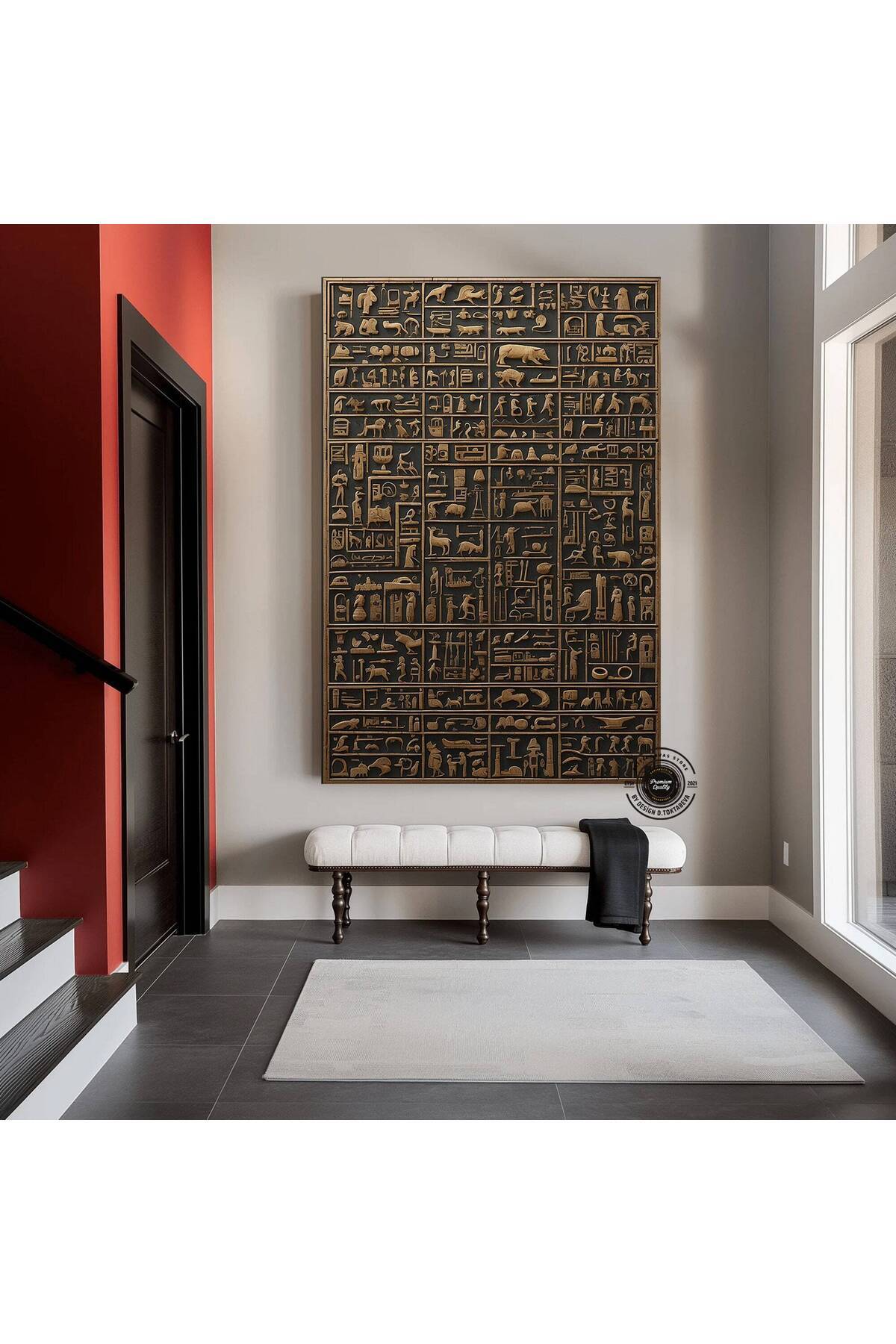 Siyah Zemin Üzerinde Antik Mısır Hiyeroglifleri Duvar Dekoru – İnce İşçilikle Sembolik Sanat Eseri Siyah Zemin Üzerinde Antik Mısır Hiyeroglifleri Duvar Dekoru – İnce İşçilikle Sembolik Sanat Eseri TRX2508 140 x 200