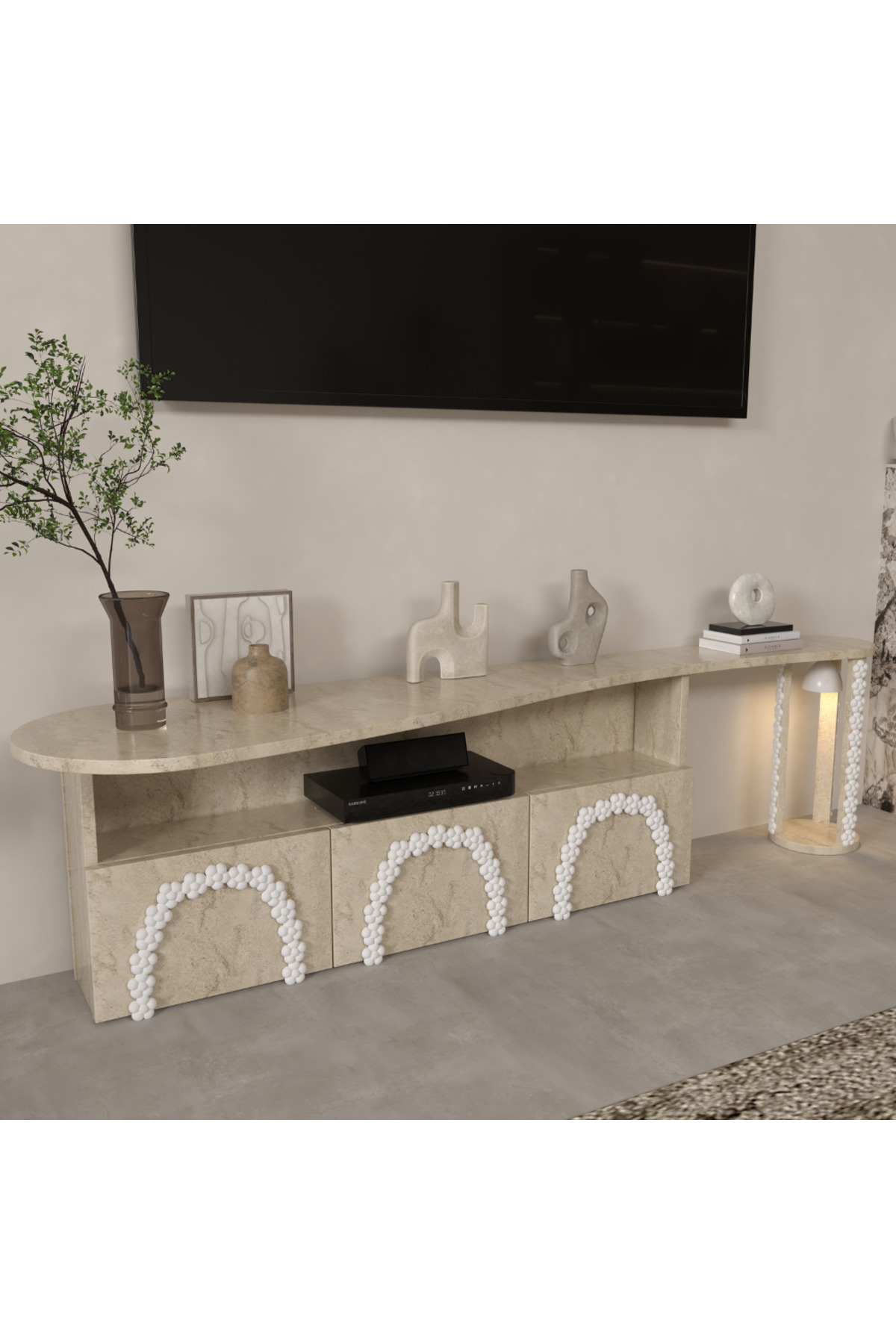 %100 MDF Traverten Desenli Kişiye160 cm Özel Ponpon Detaylı TV Ünitesi Özel Tasarım %100 MDF Traverten Desenli Kişiye160 cm Özel Ponpon Detaylı TV Ünitesi Özel Tasarım PC10082025 تک سایز