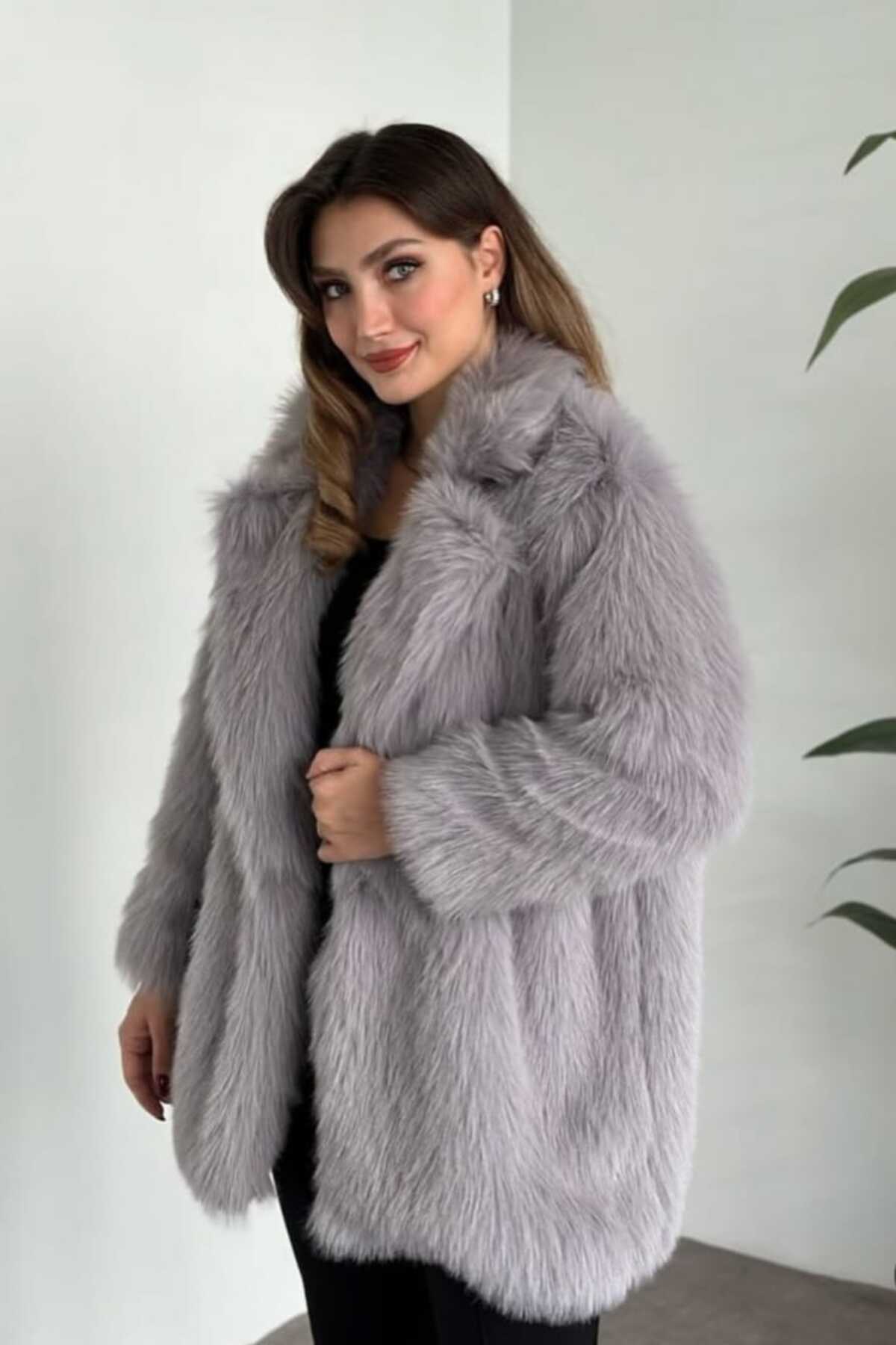 Kadın Ceket Yaka Suni Uzun Kürk Ceket Gri Kadın Ceket Yaka Suni Uzun Kürk Ceket Gri 26746 40