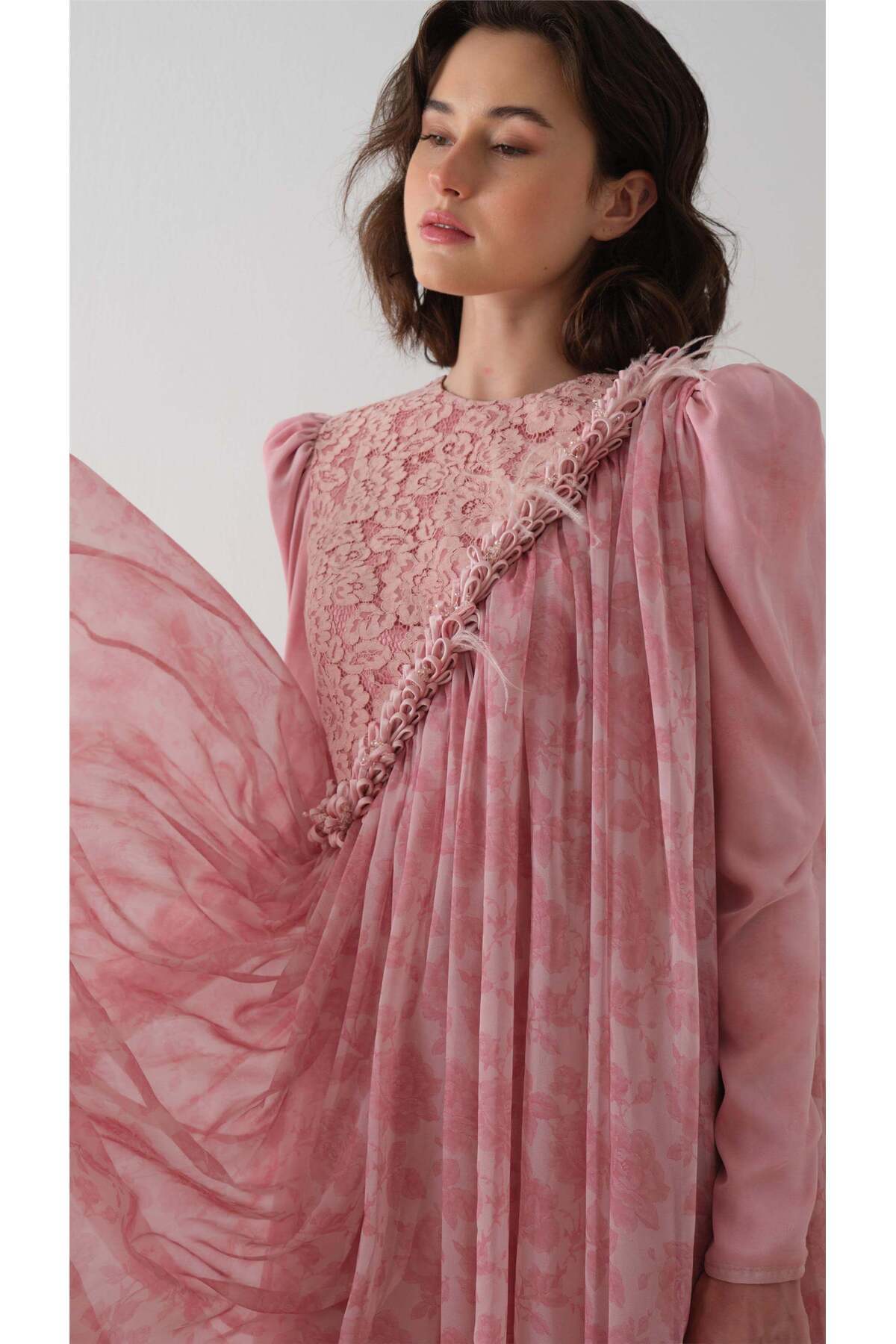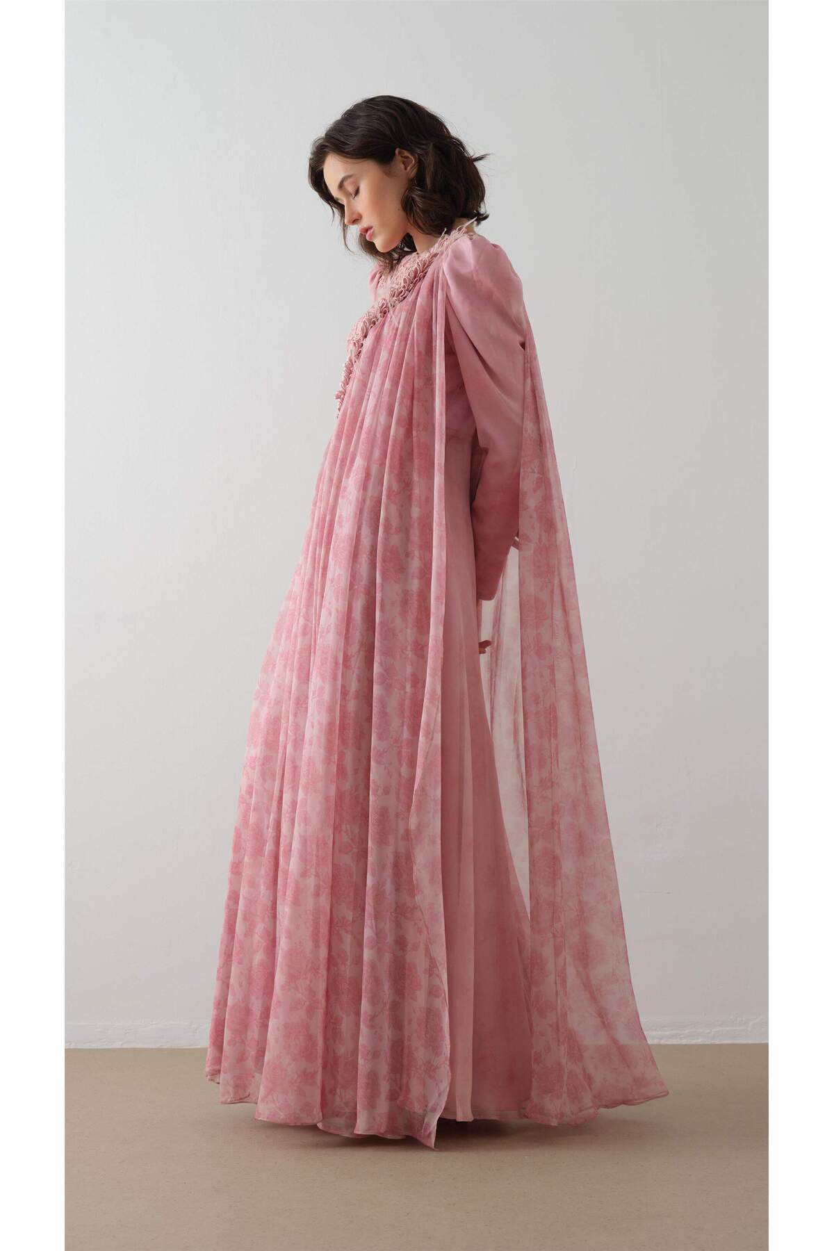 OMUZDAN DANTEL DETAYLI PELERİN ELBİSE GÜL KURUSU OMUZDAN DANTEL DETAYLI PELERİN ELBİSE GÜL KURUSU MH06.382 XL