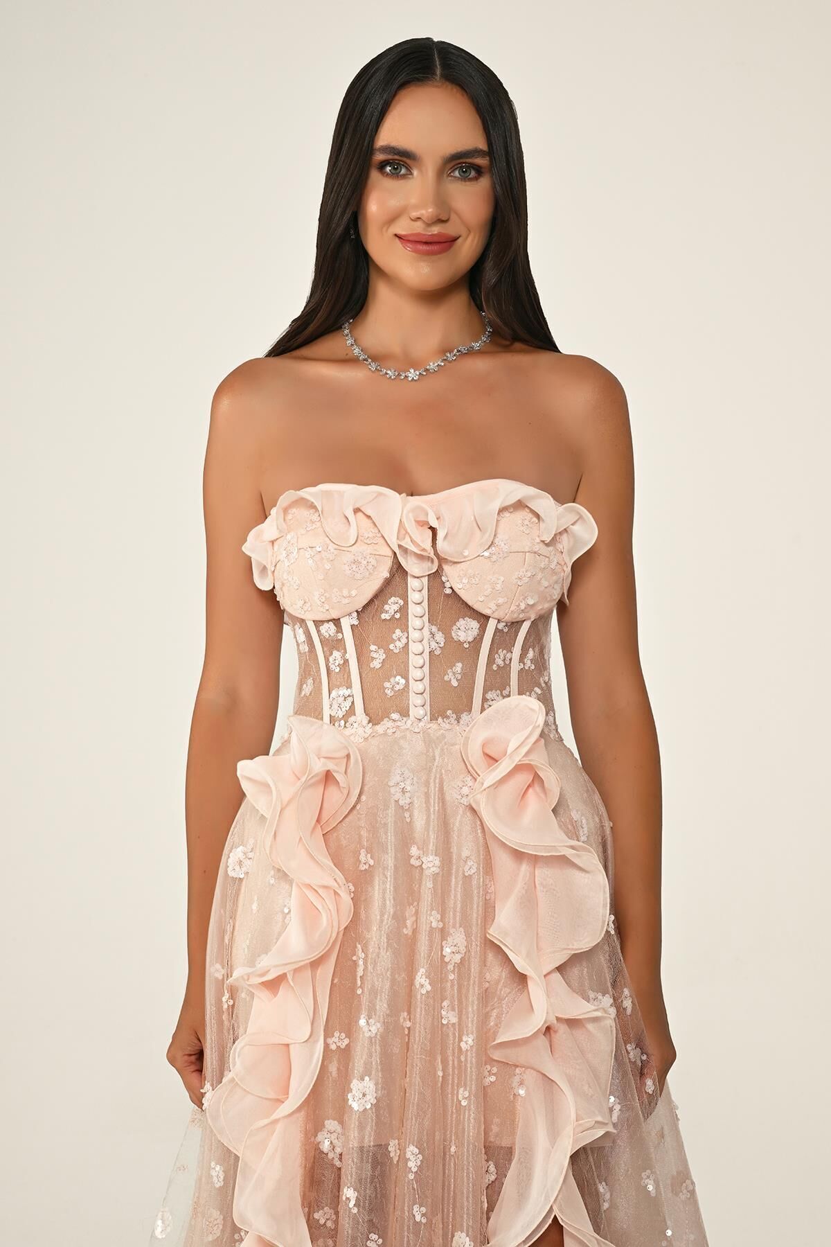 KADIN ABİYE STRAPLEZ KORSE TRANSPARAN TÜL DETAYLI ÇİÇEK DETAYLI ELBİSE KADIN ABİYE STRAPLEZ KORSE TRANSPARAN TÜL DETAYLI ÇİÇEK DETAYLI ELBİSE 7131 46