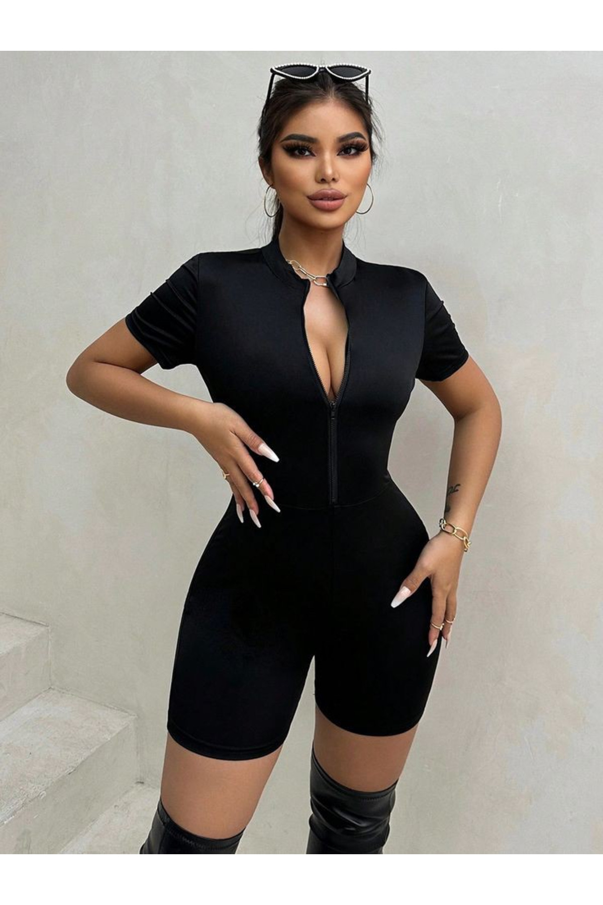 Kadın Kısa Kollu önü Fermuarlı Bodycon Dalgıç Tulum Kadın Kısa Kollu önü Fermuarlı Bodycon Dalgıç Tulum 164072