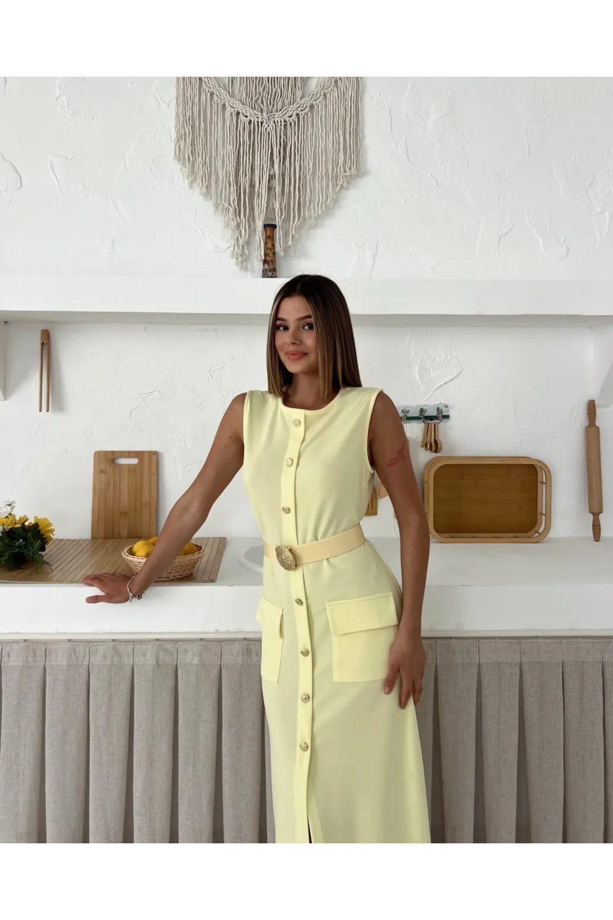 Gold Düğme Detaylı Yırtmaçlı Elbise Sarı Gold Düğme Detaylı Yırtmaçlı Elbise Sarı GDDYYYE L