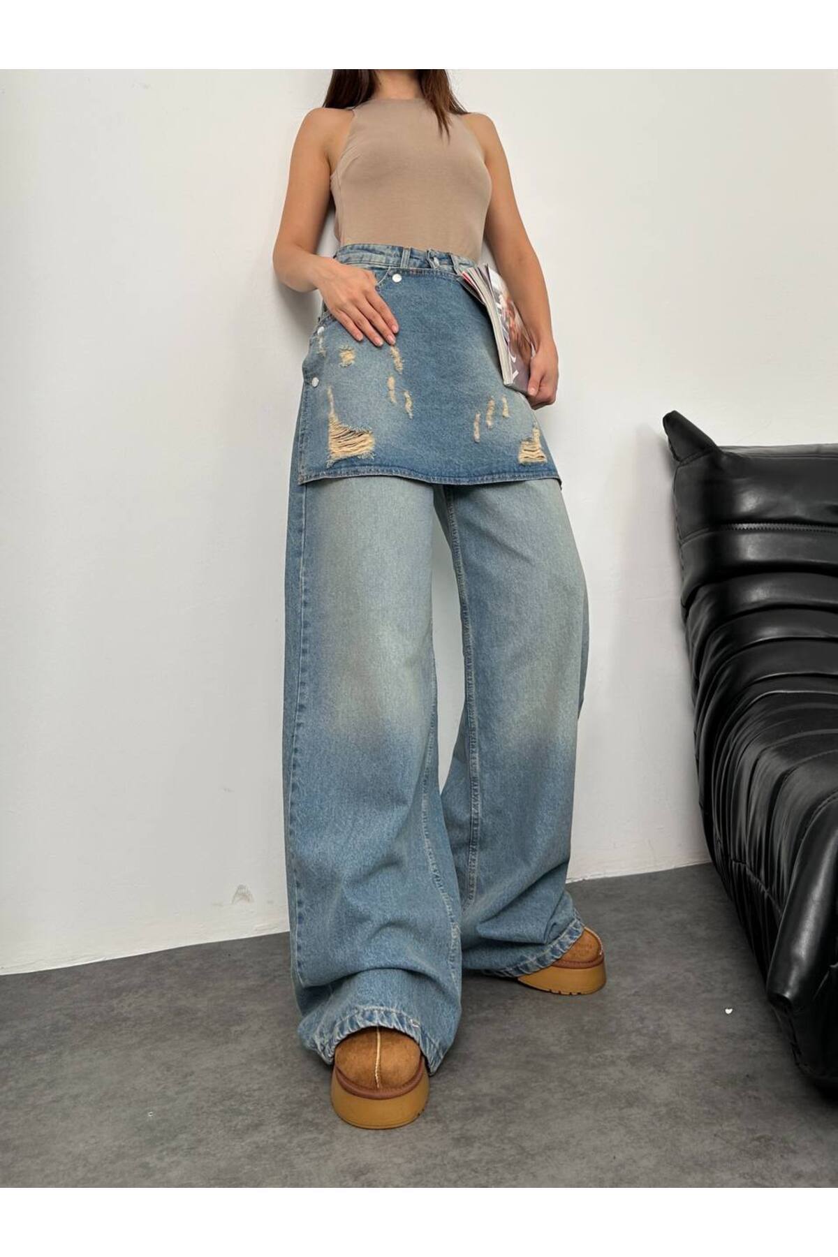 Yüksek Bel Çift Düğmeli Bol Paça Denim Pantolon Yüksek Bel Çift Düğmeli Bol Paça Denim Pantolon mtxdnm11 42