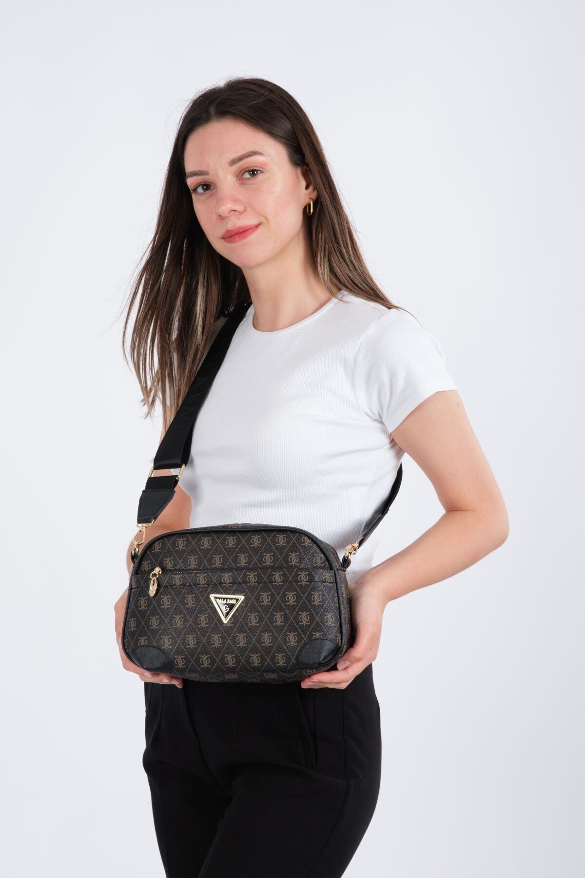 Kadın Kahverengi Monogram Desenli Uzun Askılı Çapraz Omuz Çantası Kadın Kahverengi Monogram Desenli Uzun Askılı Çapraz Omuz Çantası polo228 تک سایز