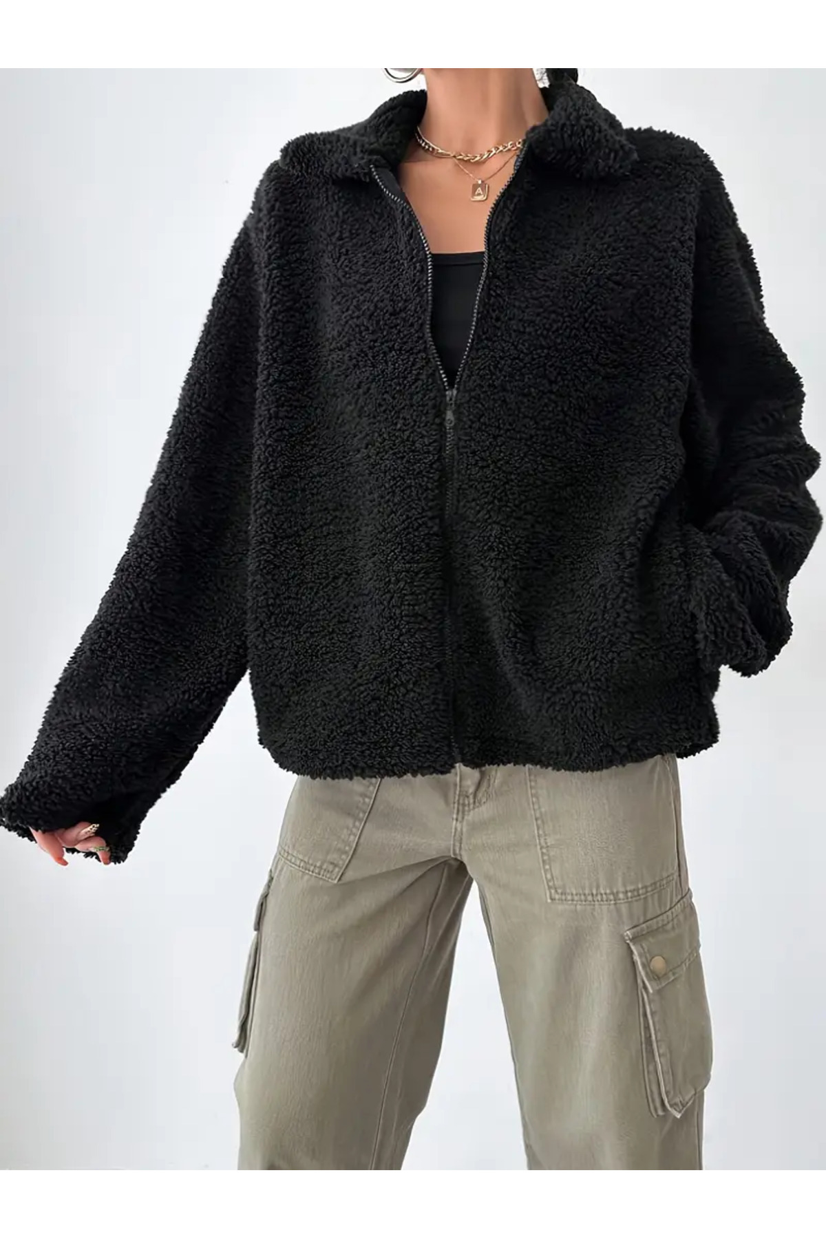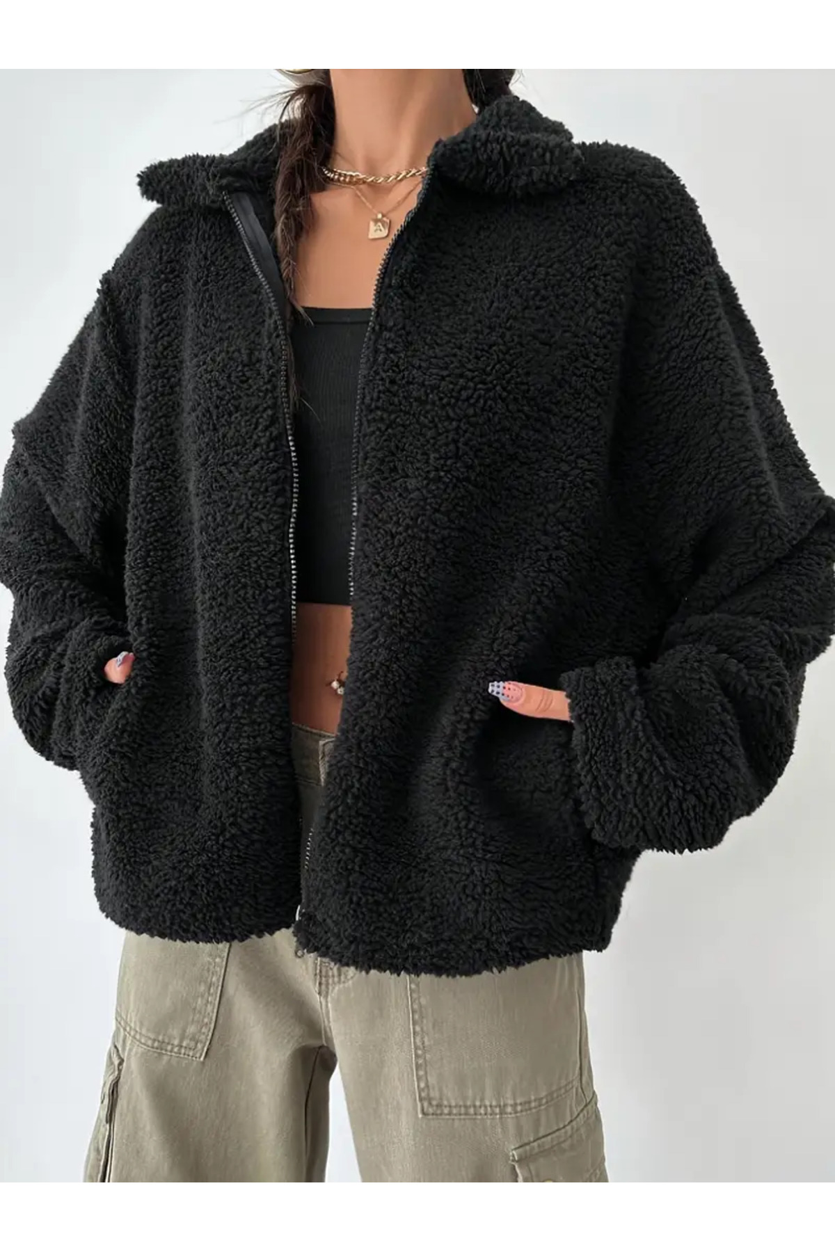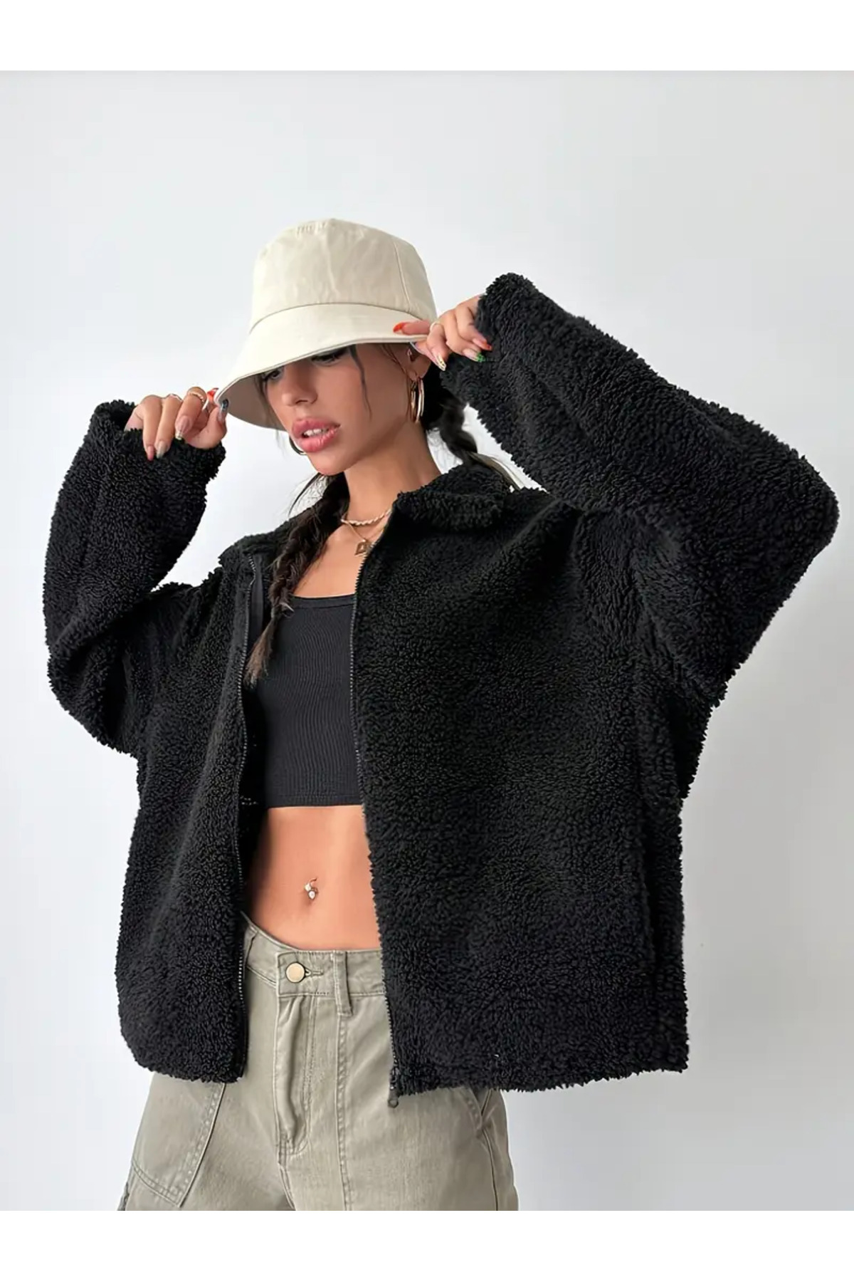 Oversize Kuzu Tüyü Peluş Kumaş Içi Astarlı Fermuarlı Siyah Ceket Mont Oversize Kuzu Tüyü Peluş Kumaş Içi Astarlı Fermuarlı Siyah Ceket Mont peluscekt XL