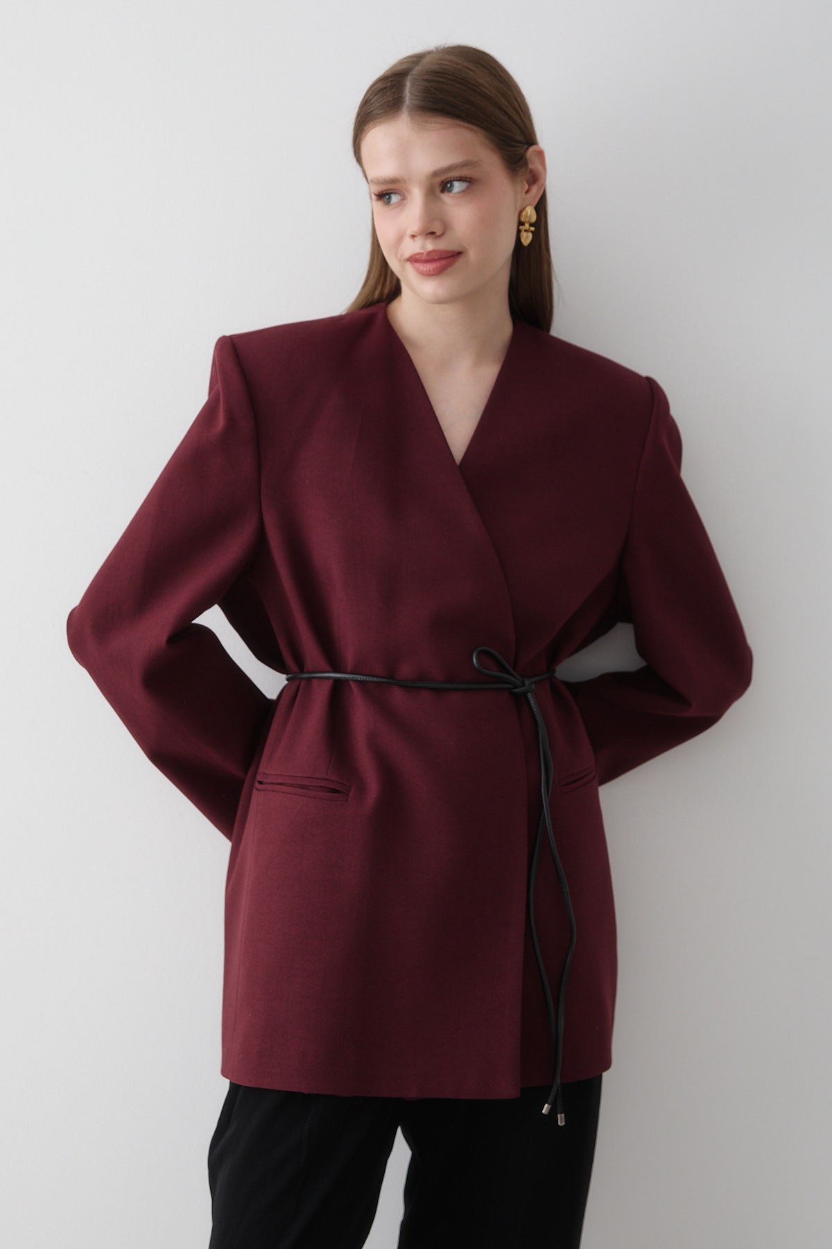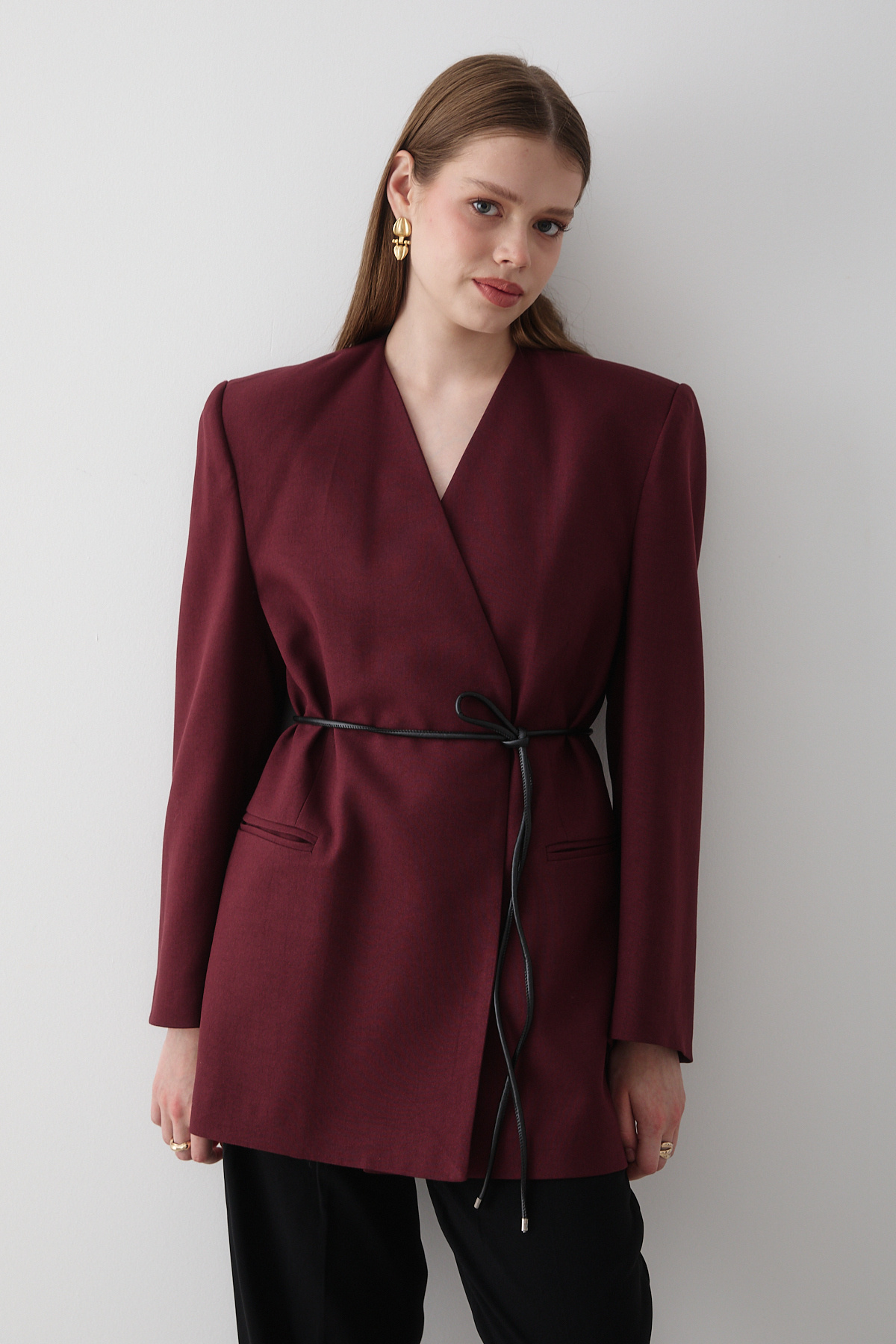 Kadın Bordo Kruvaze Kemer Detaylı Oversize Blazer Ceket Kadın Bordo Kruvaze Kemer Detaylı Oversize Blazer Ceket 7454 Standart