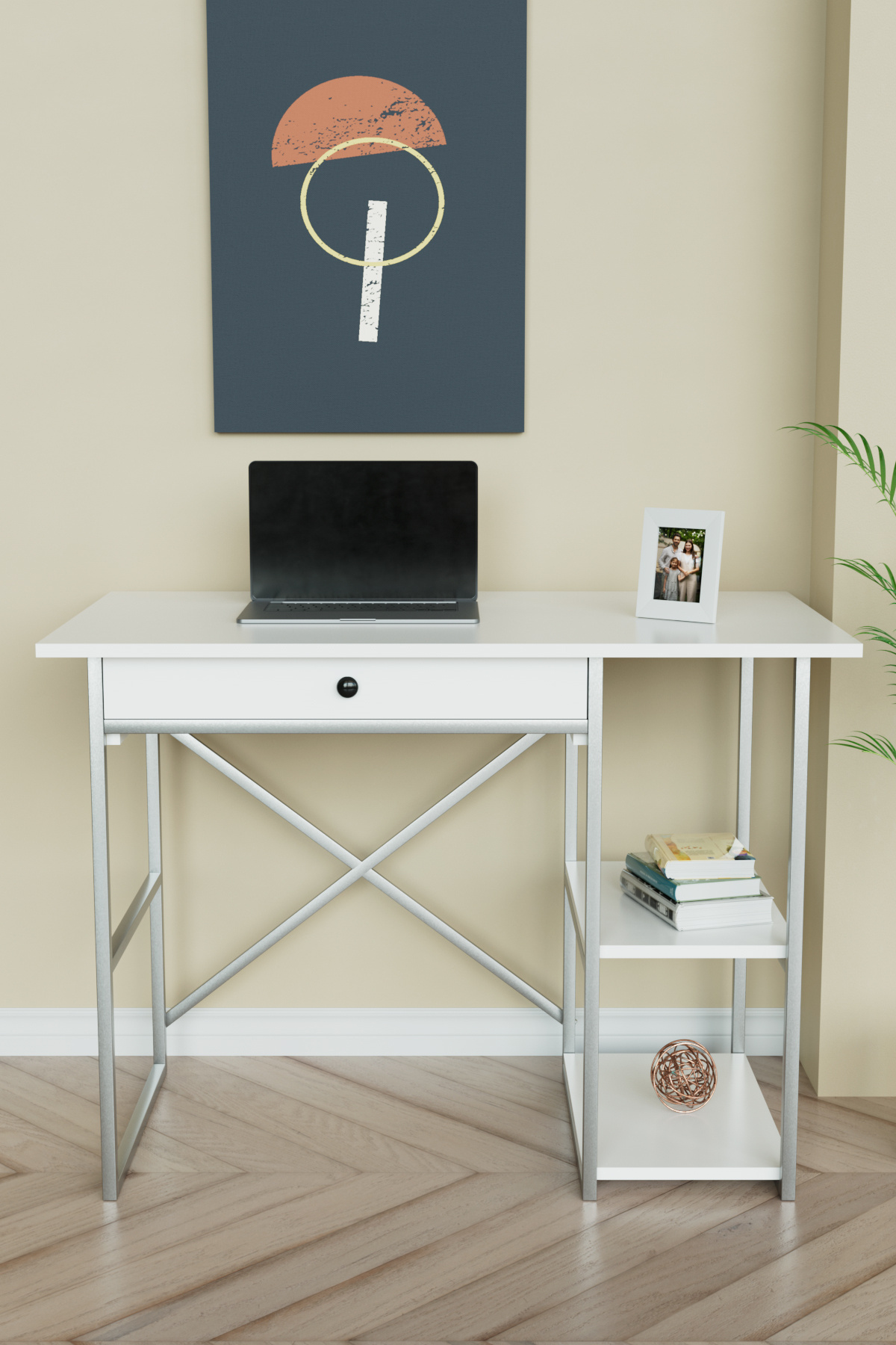 Çekmeceli Ve 2 Raflı Çalışma Masası 110x60 Cm Beyaz-Gümüş Metal Çekmeceli Ve 2 Raflı Çalışma Masası 110x60 Cm Beyaz-Gümüş Metal CMasa0890cgd80 تک سایز