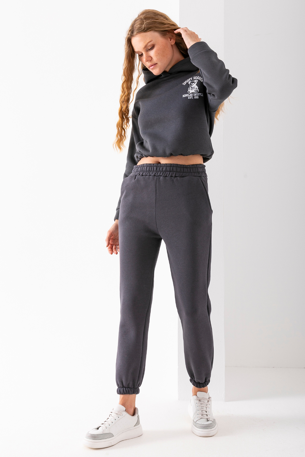 Kadın Kapüşonlu Sporty Nakışlı Stoper Detaylı Eşofman Takımı Füme - 2607 Kadın Kapüşonlu Sporty Nakışlı Stoper Detaylı Eşofman Takımı Füme - 2607 910-2607 XL