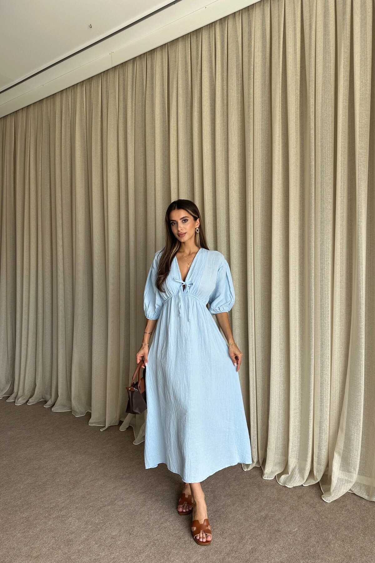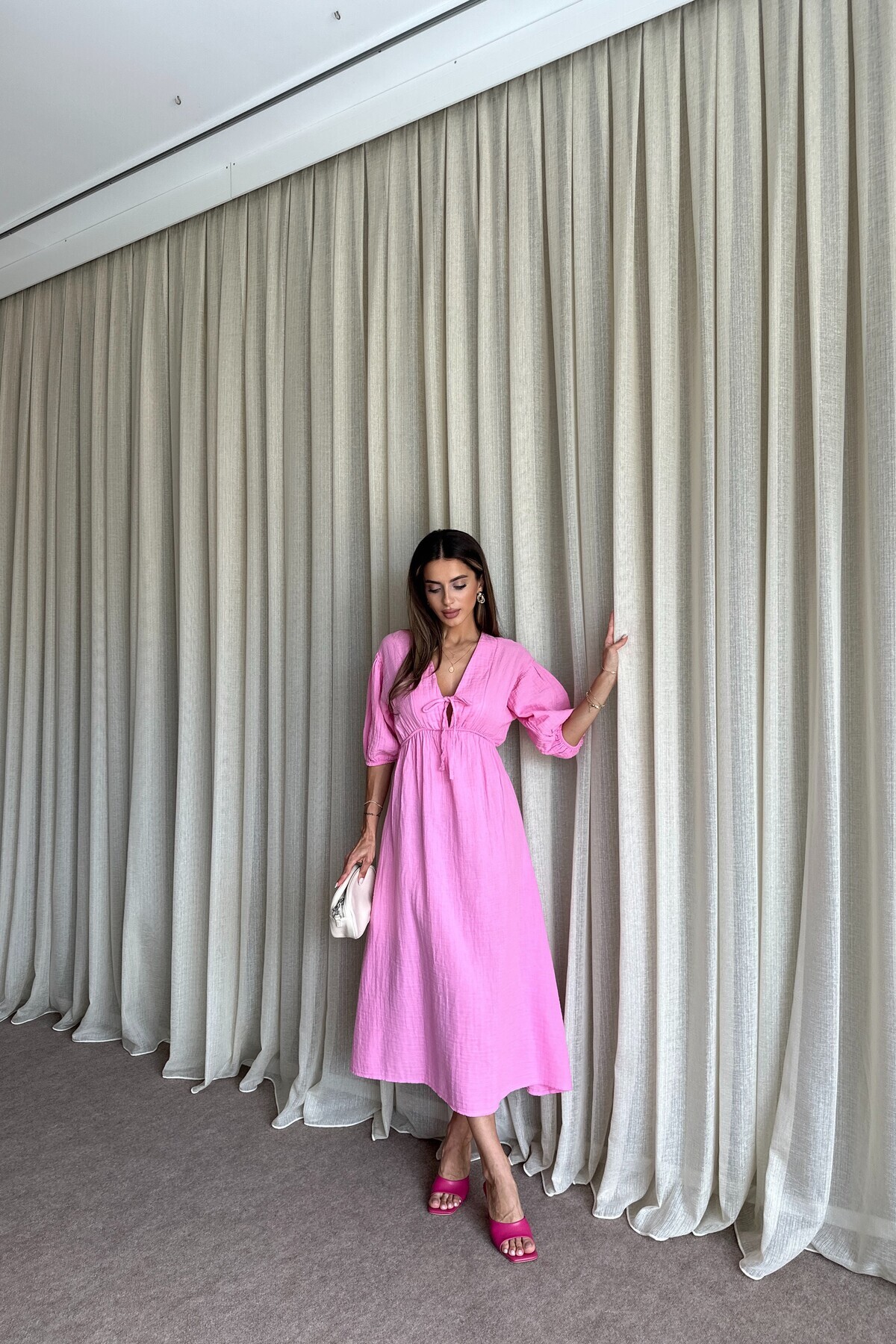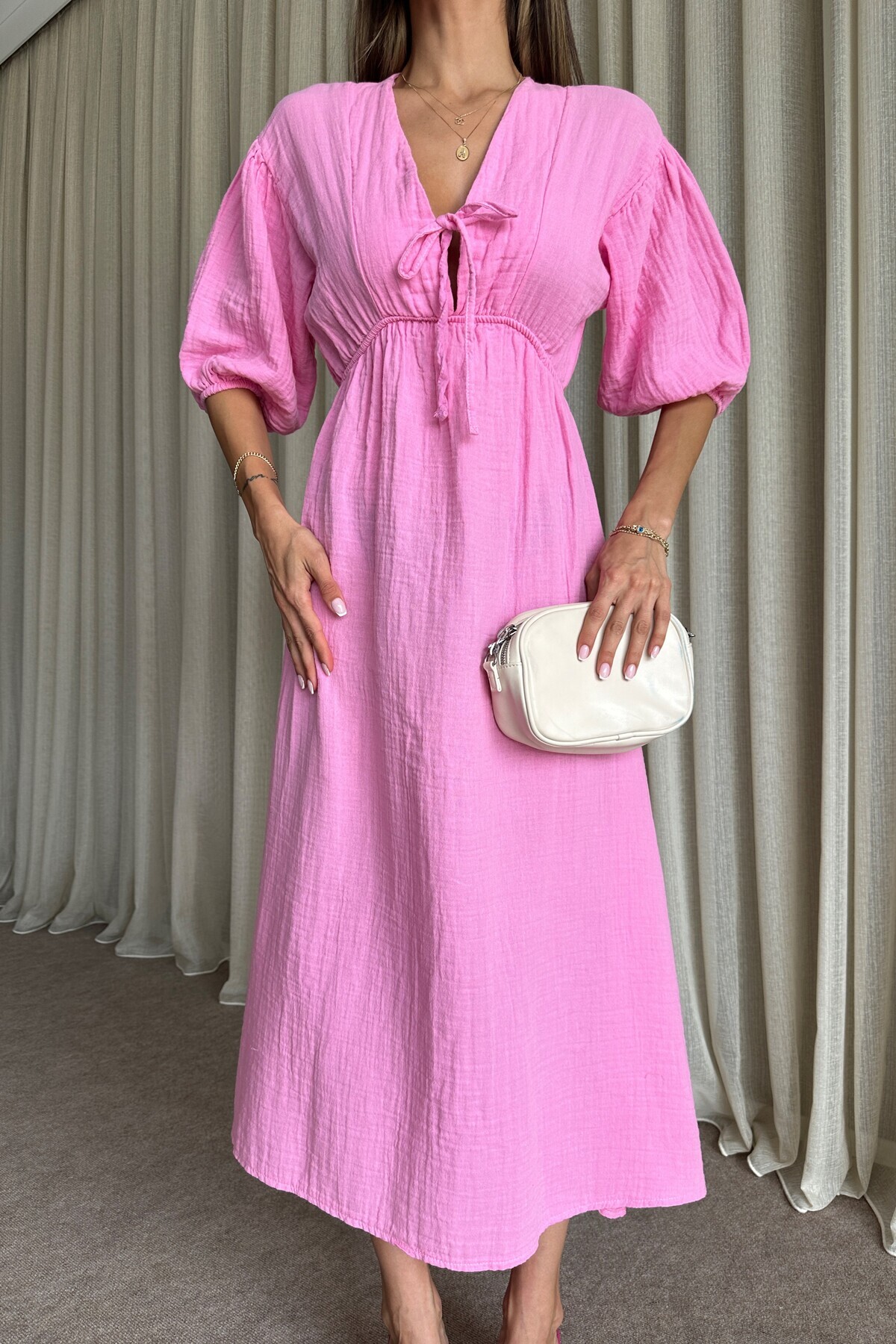 Kadın Pembe Önü Bağlamalı Balon Kol Müslin Uzun Elbise Kadın Pembe Önü Bağlamalı Balon Kol Müslin Uzun Elbise DR965 L