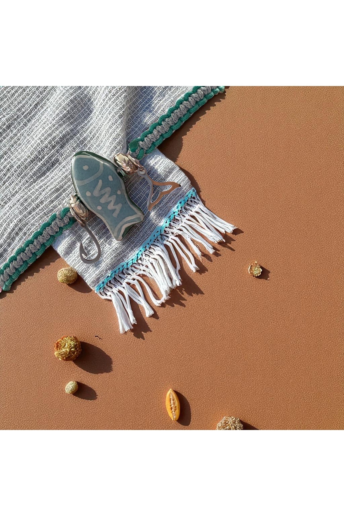 - Materyal Bileşeni : Mavi Balık Figür Seramik Boncuk , Çelik Balık ve Olta Charm, Mavi ve Turkuaz Paraşüt İpi