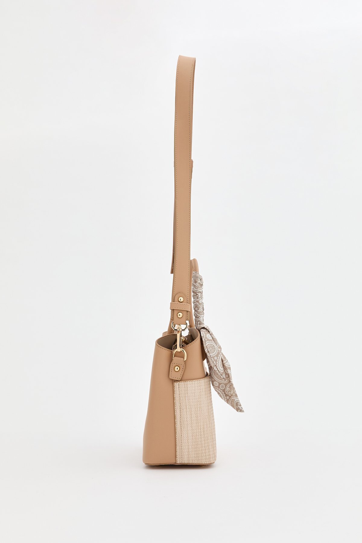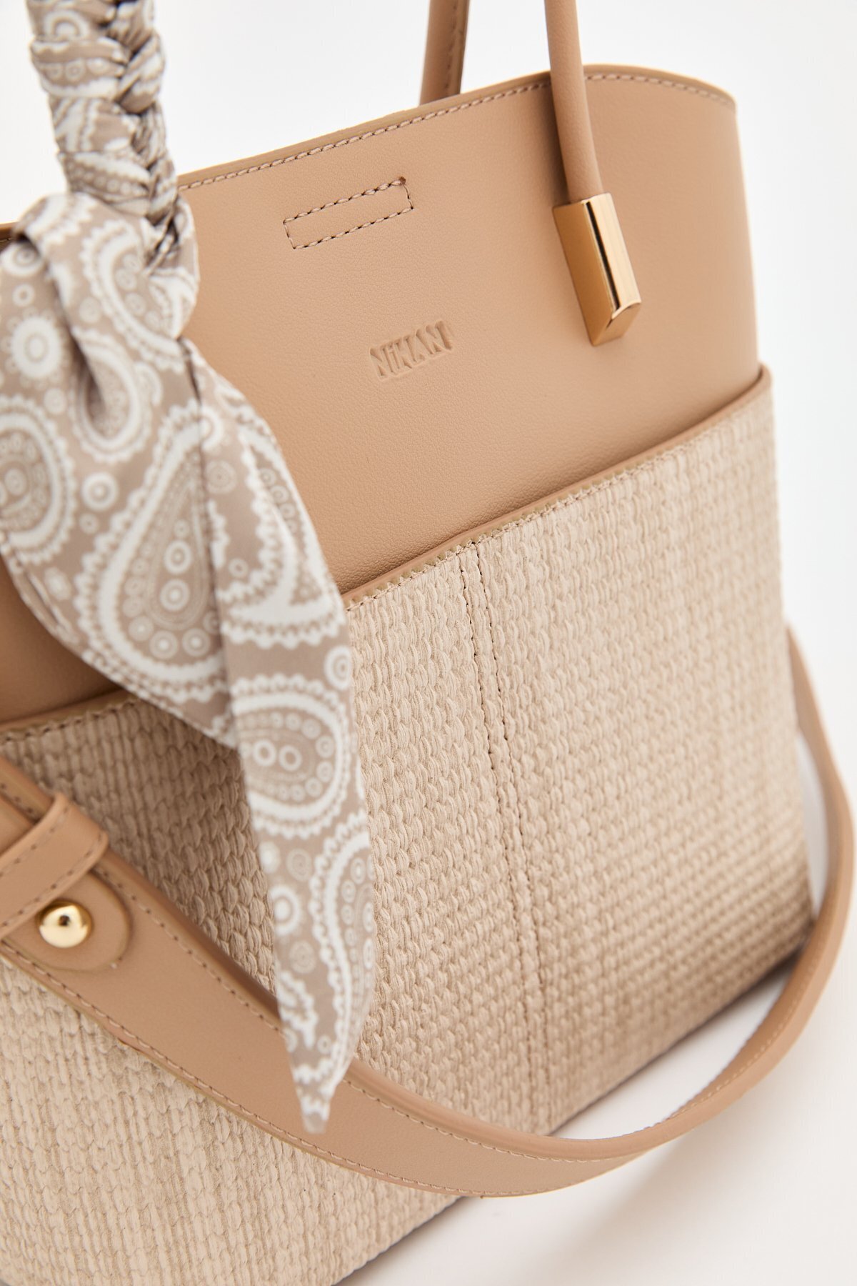 Fular Aksesuarlı Örgülü Tote Çanta Bej Fular Aksesuarlı Örgülü Tote Çanta Bej 252CTS102NH.1 تک سایز