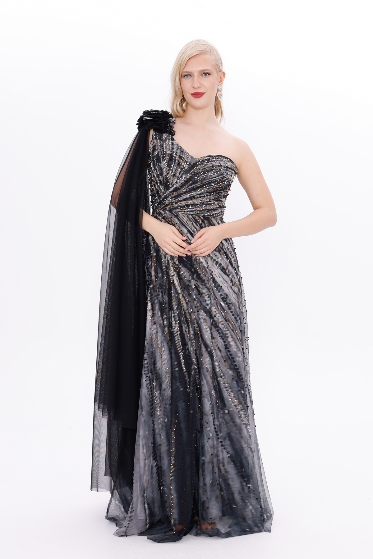 Omuzları El İşi Taşlı Saten Astarlı Abiye Elbise Omuzları El İşi Taşlı Saten Astarlı Abiye Elbise 0185 44