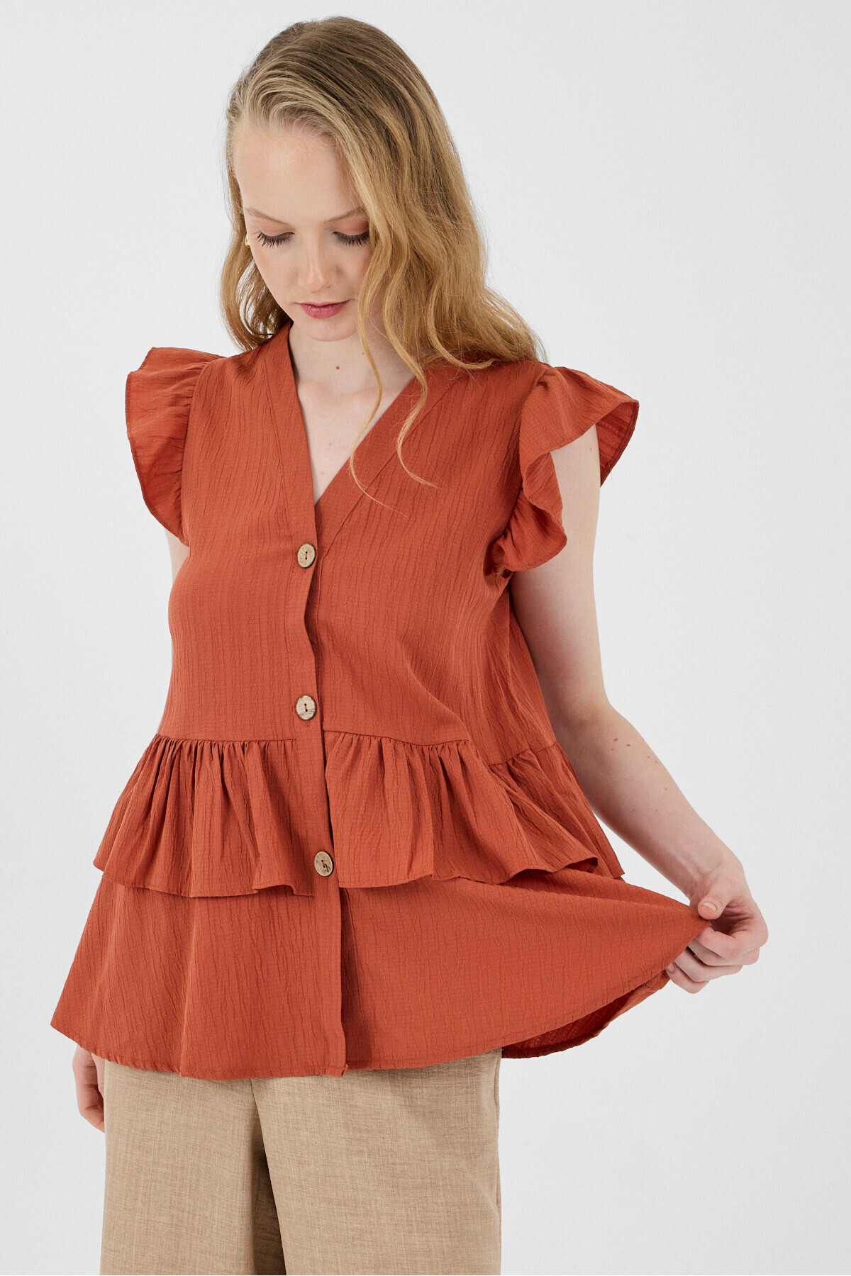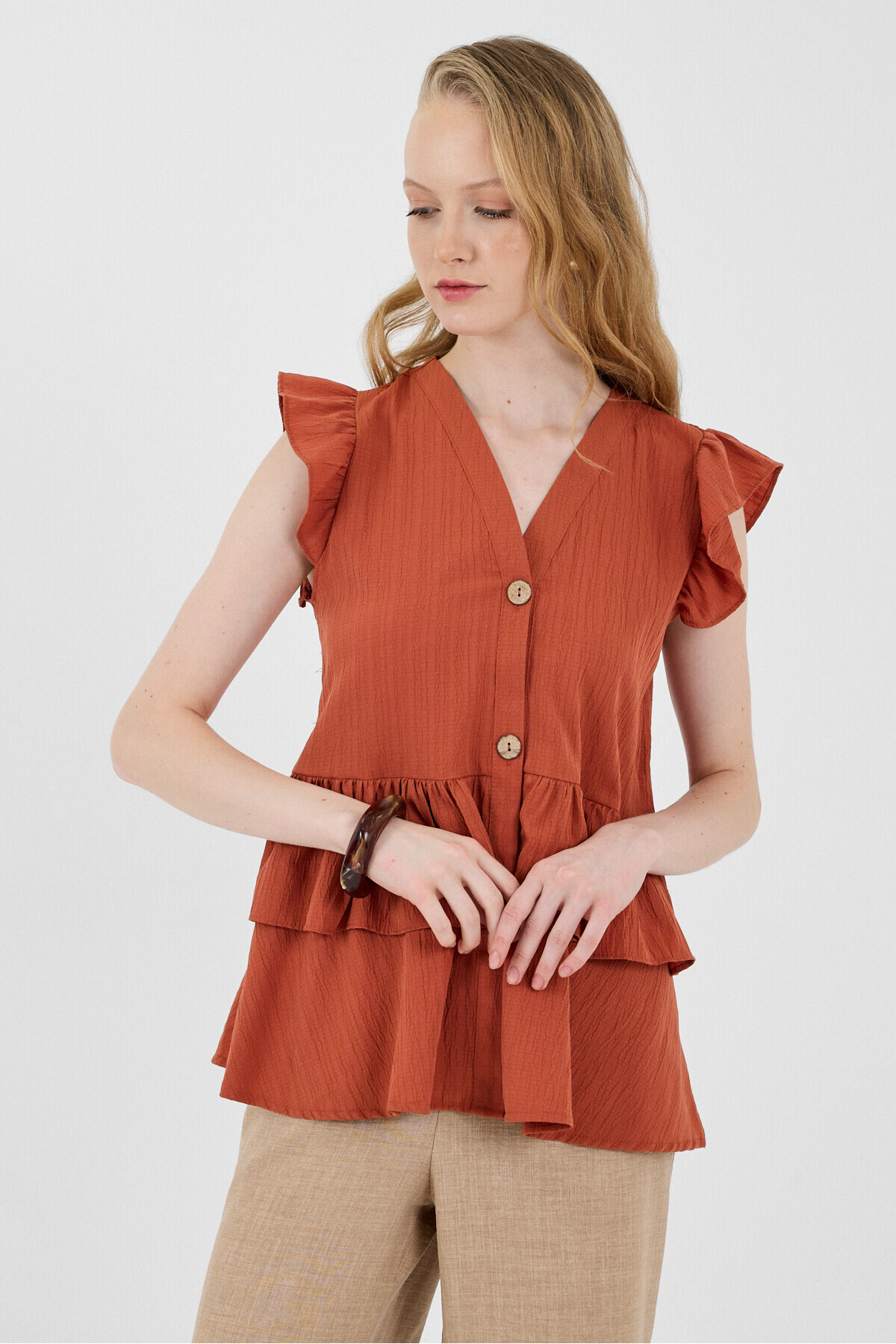 Kiremit V Yaka Düğmeli Fırfır Kol Bluz 8052A Kiremit V Yaka Düğmeli Fırfır Kol Bluz 8052A 25Y1123UST228 42