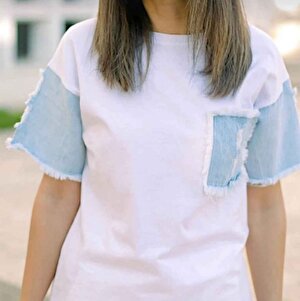 Kadın Beyaz Kot Garnili Pamuk Tişört Kadın Beyaz Kot Garnili Pamuk Tişört kt123fr XL