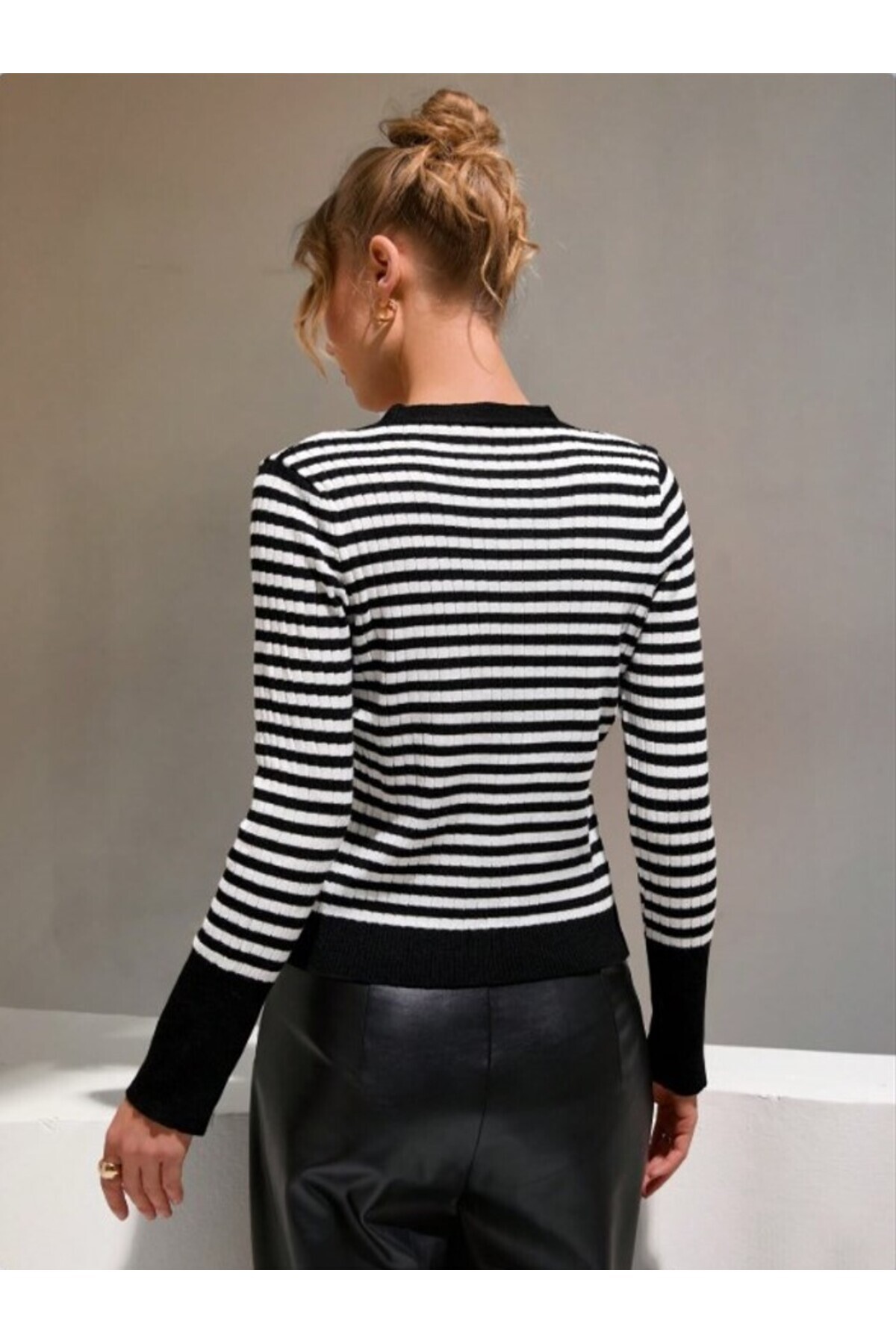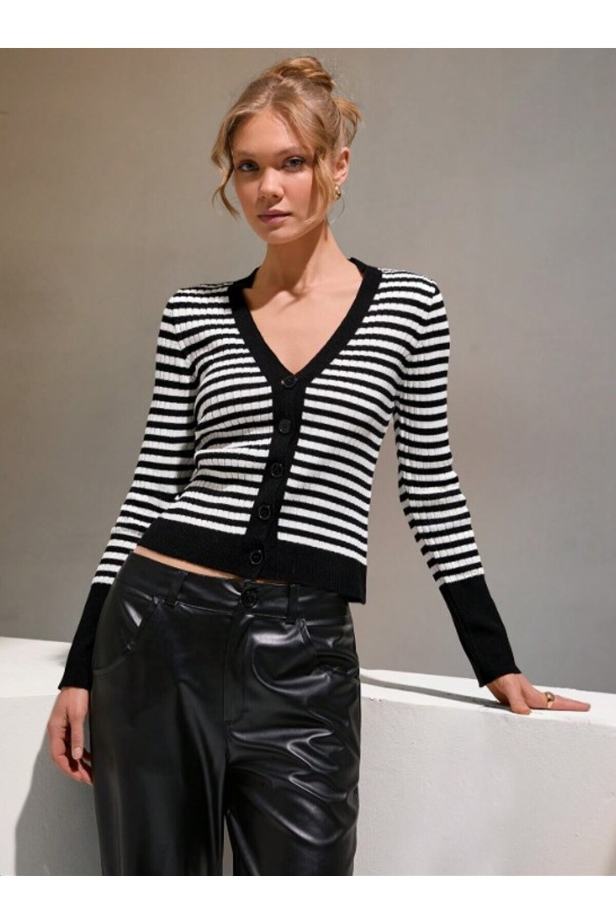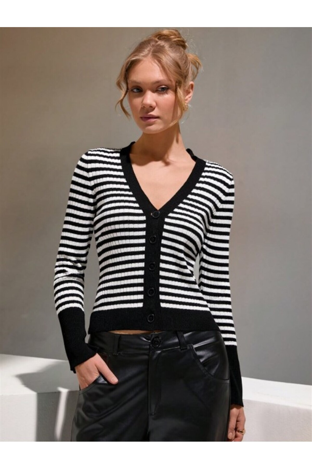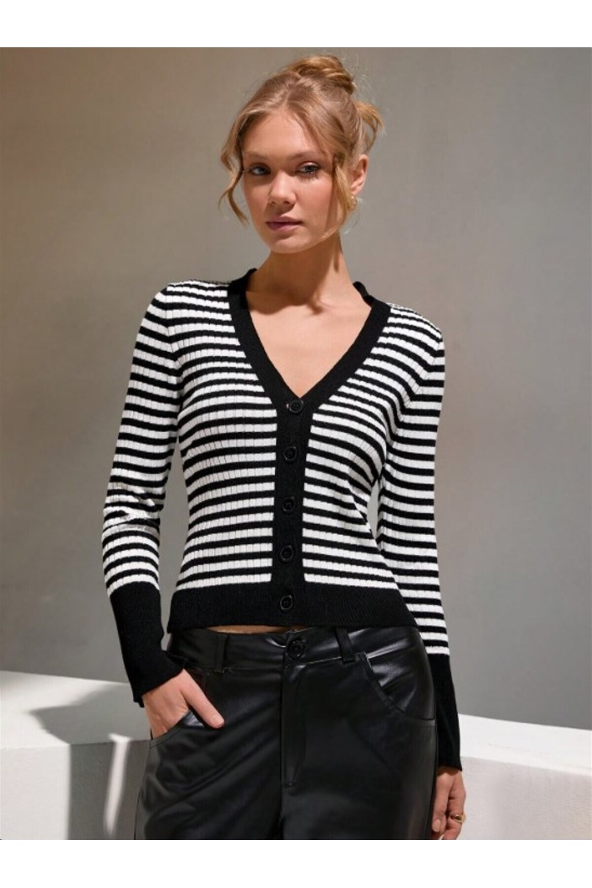 Kadın İnce Çizgili Zebra Desen Düğmeli Triko Hırka Kadın İnce Çizgili Zebra Desen Düğmeli Triko Hırka fmoda1295 L
