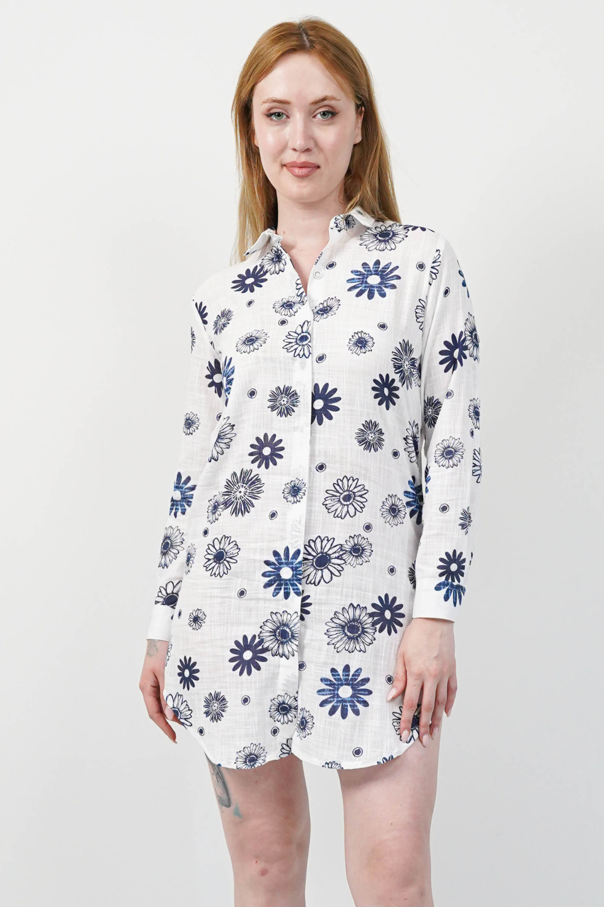 Çiçekli Motif Hakim Yaka Yandan Düğmeli Uzun Kollu Keten Beyaz Gömlek Tunik Çiçekli Motif Hakim Yaka Yandan Düğmeli Uzun Kollu Keten Beyaz Gömlek Tunik 5914 3XL