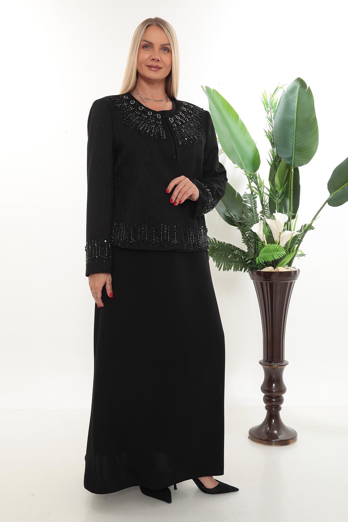 Yakası ve Ceketi Taşlı Astarlı Büyük Beden Siyah Ceket Elbise Yakası ve Ceketi Taşlı Astarlı Büyük Beden Siyah Ceket Elbise 4172S 48