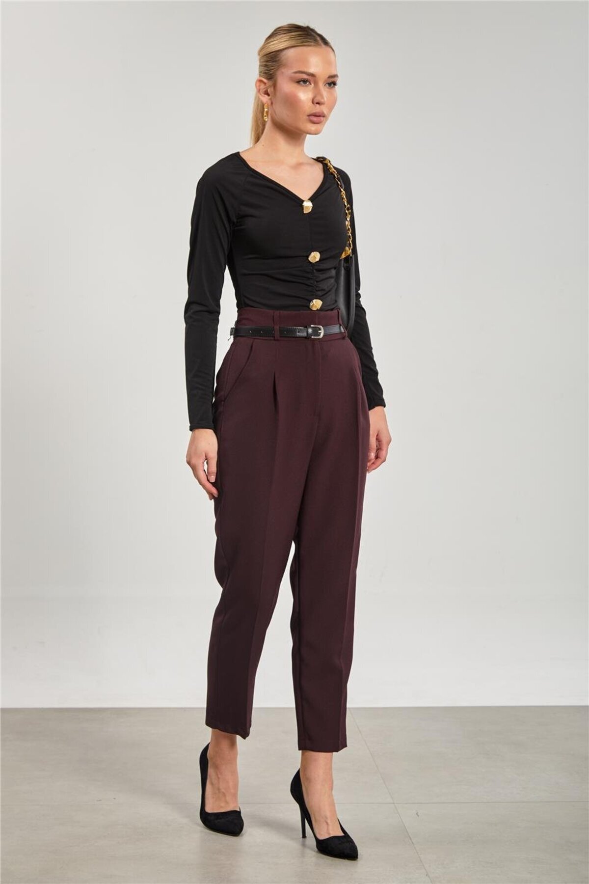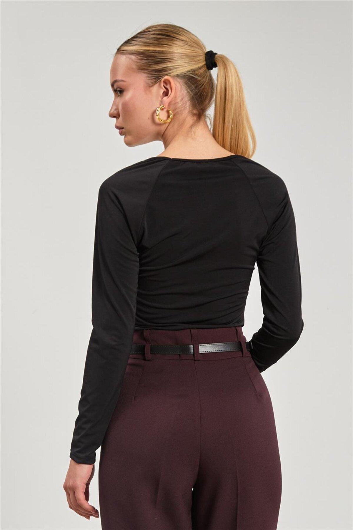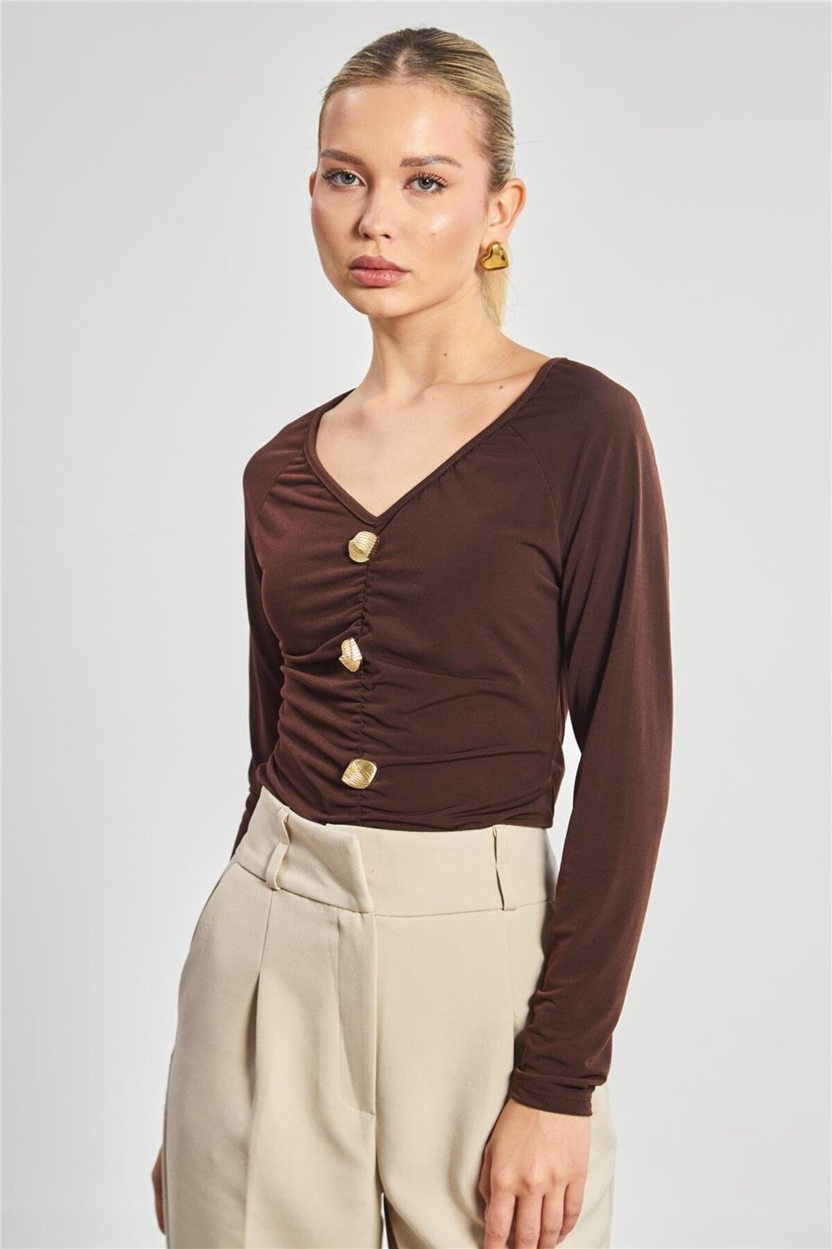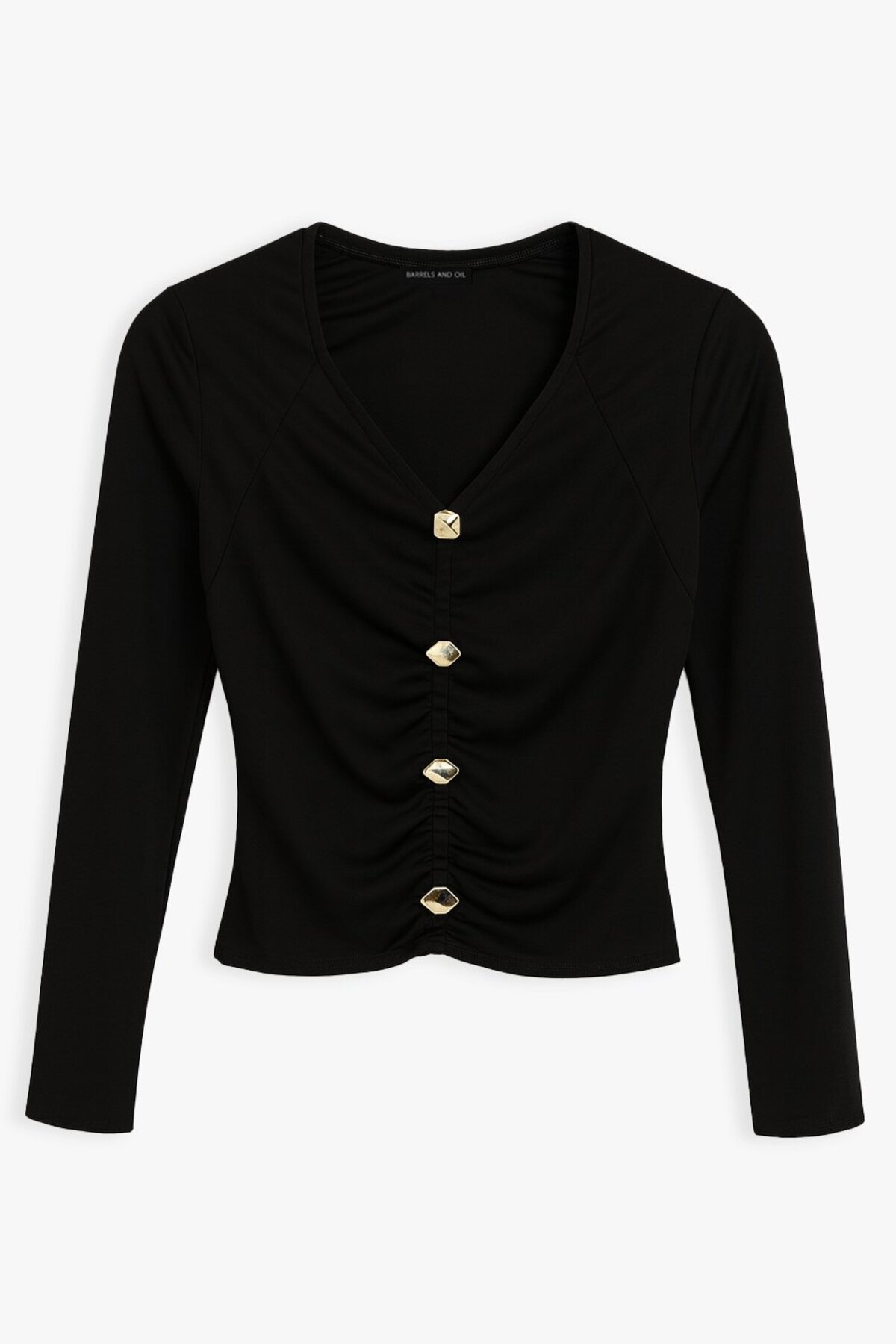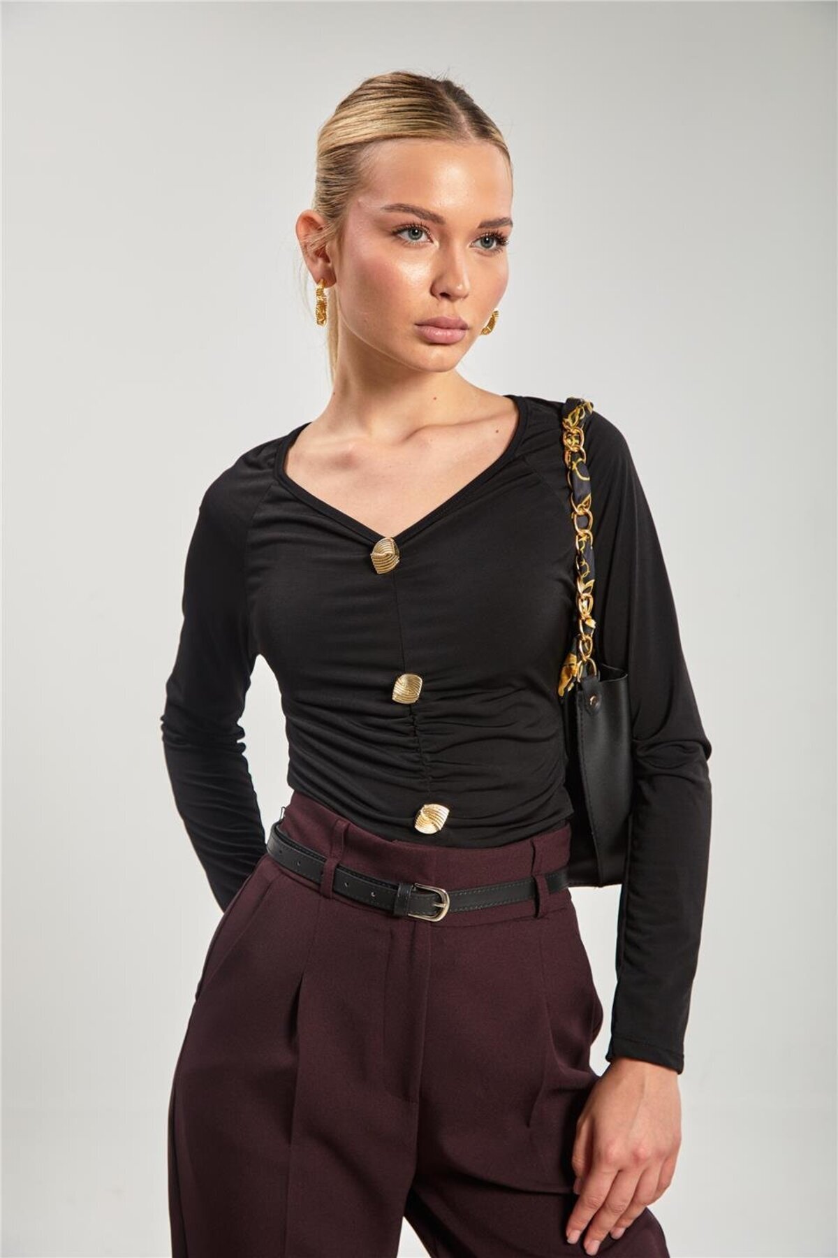 Kadın V Yaka Gold Düğmeli Bluz - Siyah Kadın V Yaka Gold Düğmeli Bluz - Siyah 1012-25M35007 L