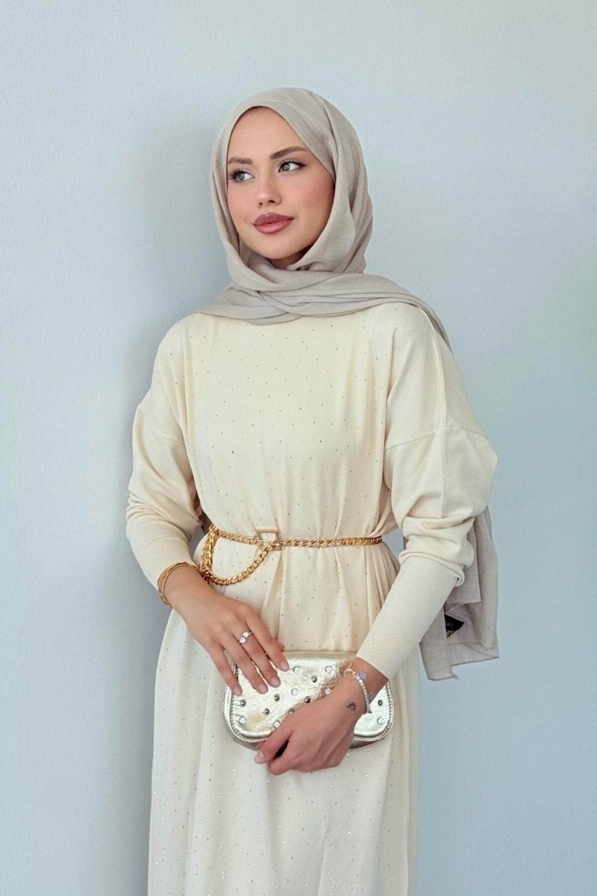 Merserize Taşlı Elbise Krem Merserize Taşlı Elbise Krem 25270 Standart
