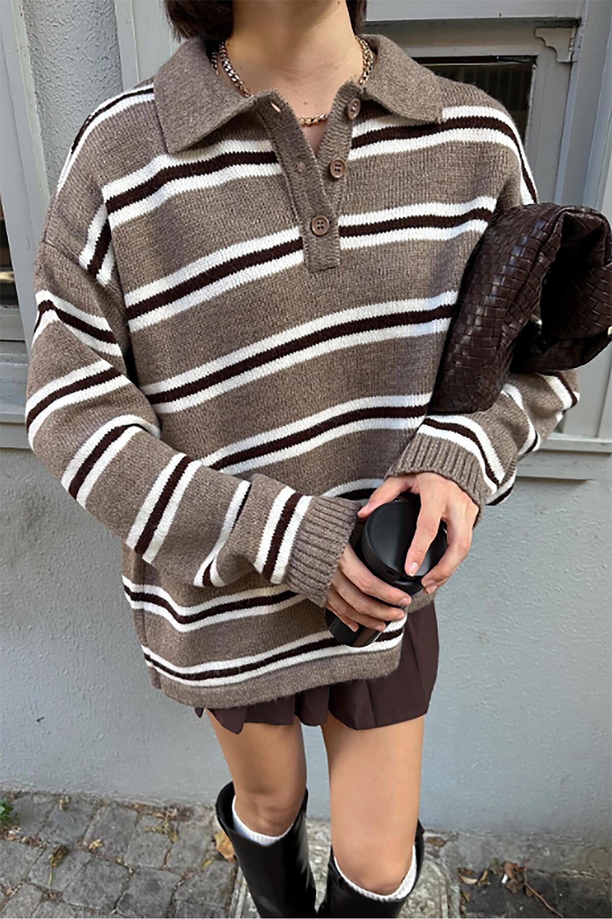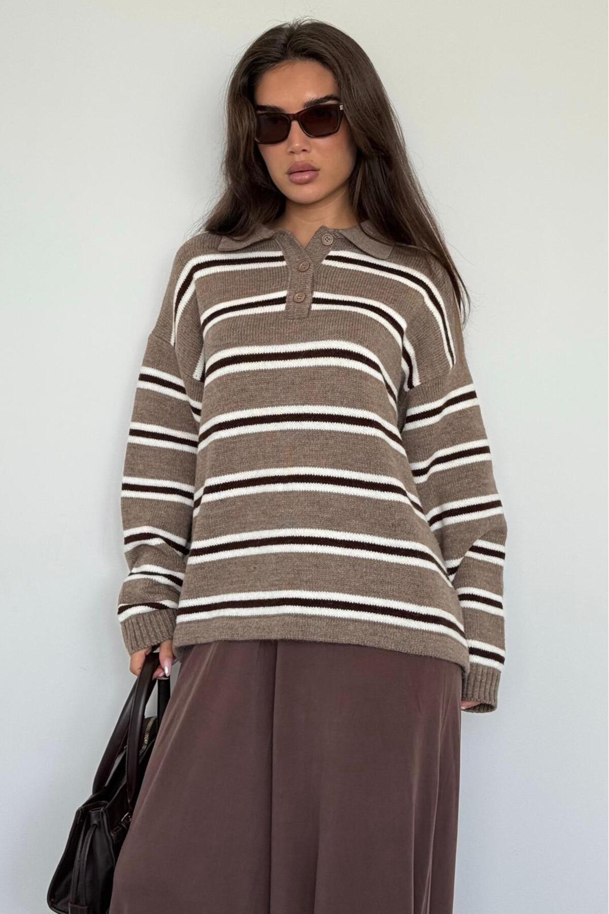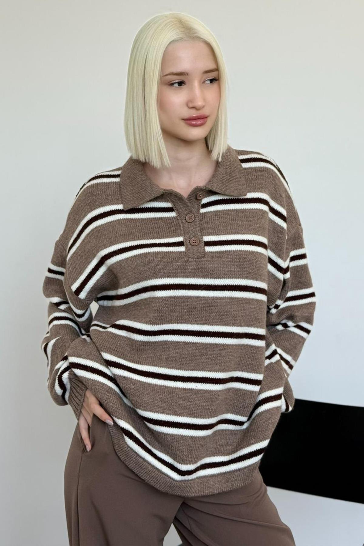Vizon Polo Yaka Çizgili Kadın Triko Kazak Mg2469 Vizon Polo Yaka Çizgili Kadın Triko Kazak Mg2469 MG2469 L