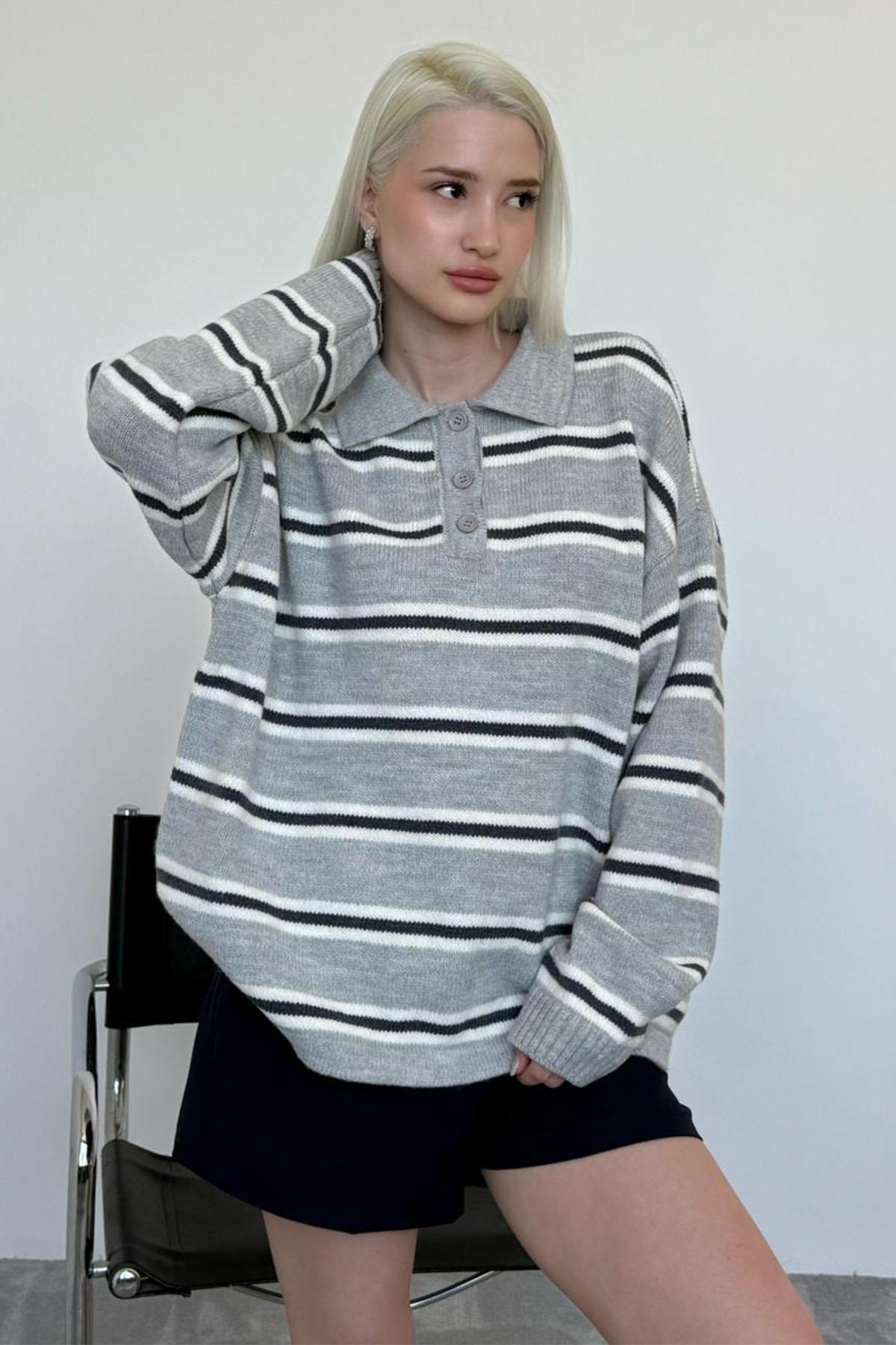 Gri Polo Yaka Çizgili Kadın Triko Kazak Mg2469 Gri Polo Yaka Çizgili Kadın Triko Kazak Mg2469 MG2469 L
