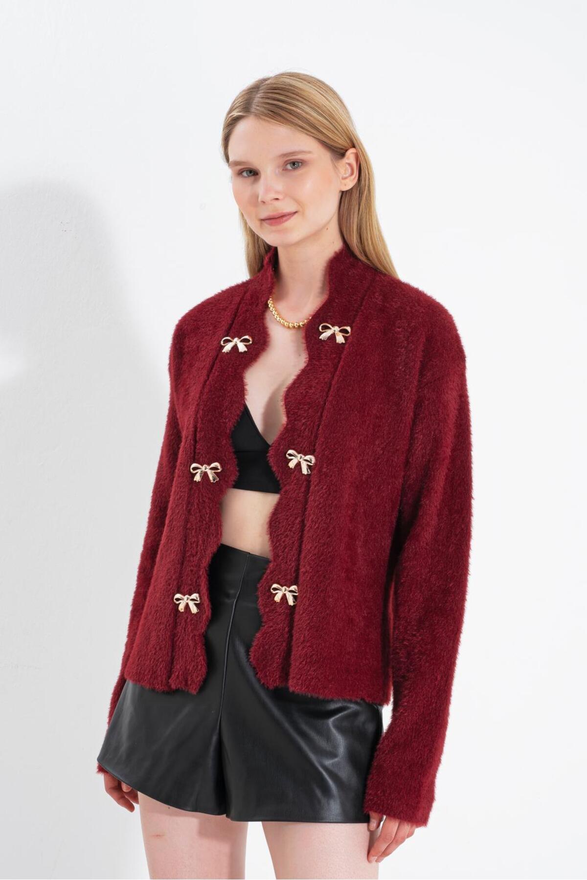 Kadın Bordo Fiyonk Aksesuarlı Sakallı Basic Triko Hırka Kadın Bordo Fiyonk Aksesuarlı Sakallı Basic Triko Hırka K2012 Standart