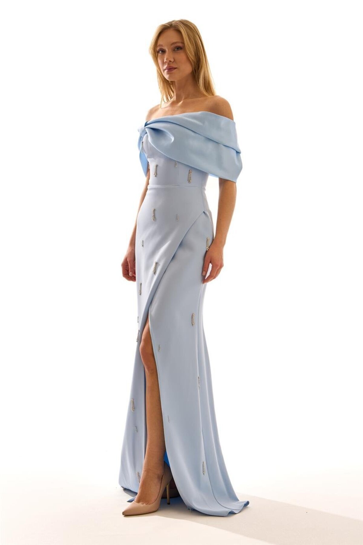 Off-Shoulder Drapeli Taş İşlemeli Yırtmaçlı Kadın Abiye Elbise Off-Shoulder Drapeli Taş İşlemeli Yırtmaçlı Kadın Abiye Elbise 5135 42