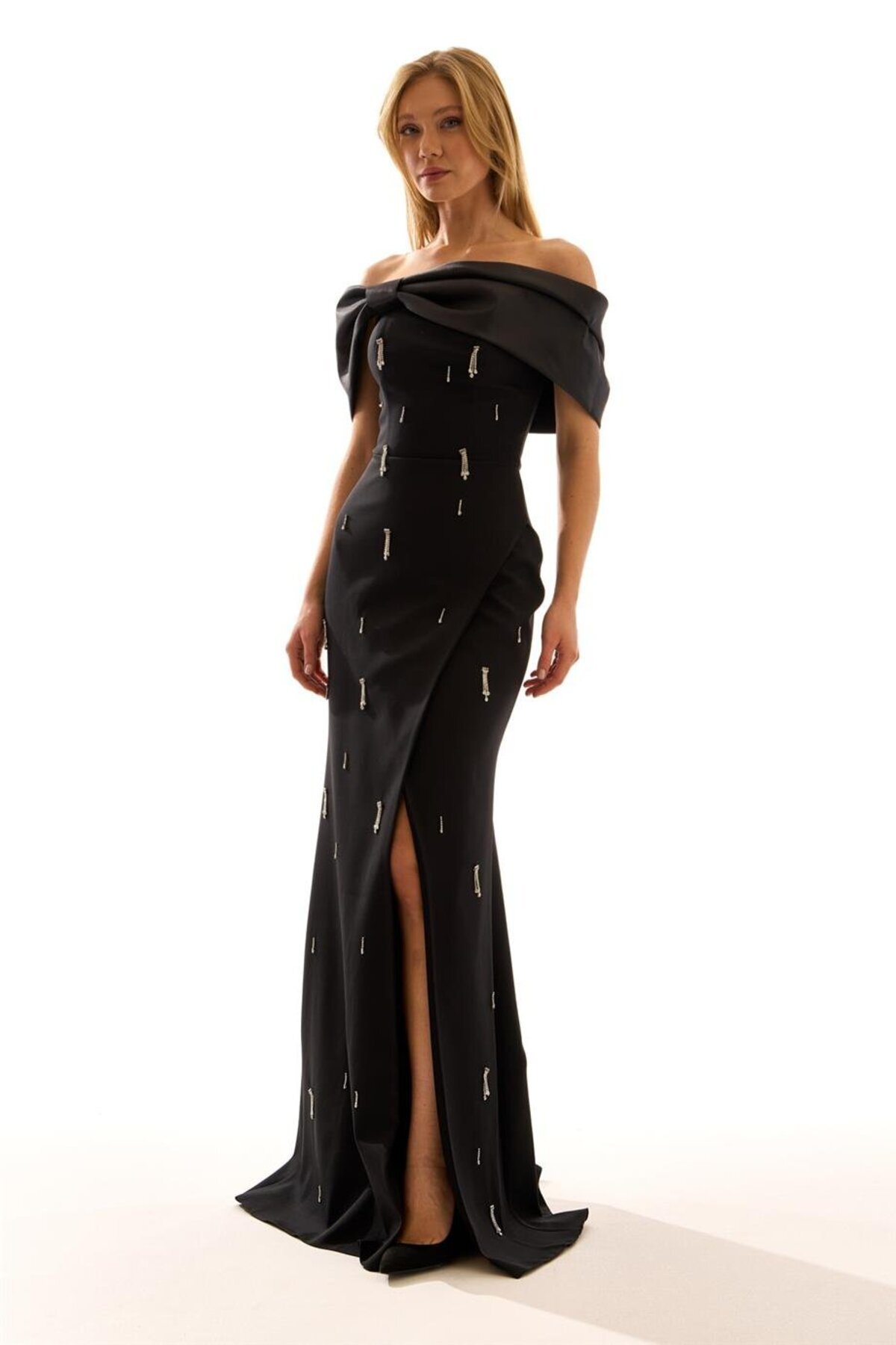 Off-Shoulder Drapeli Taş İşlemeli Yırtmaçlı Kadın Abiye Elbise Off-Shoulder Drapeli Taş İşlemeli Yırtmaçlı Kadın Abiye Elbise 5135 42