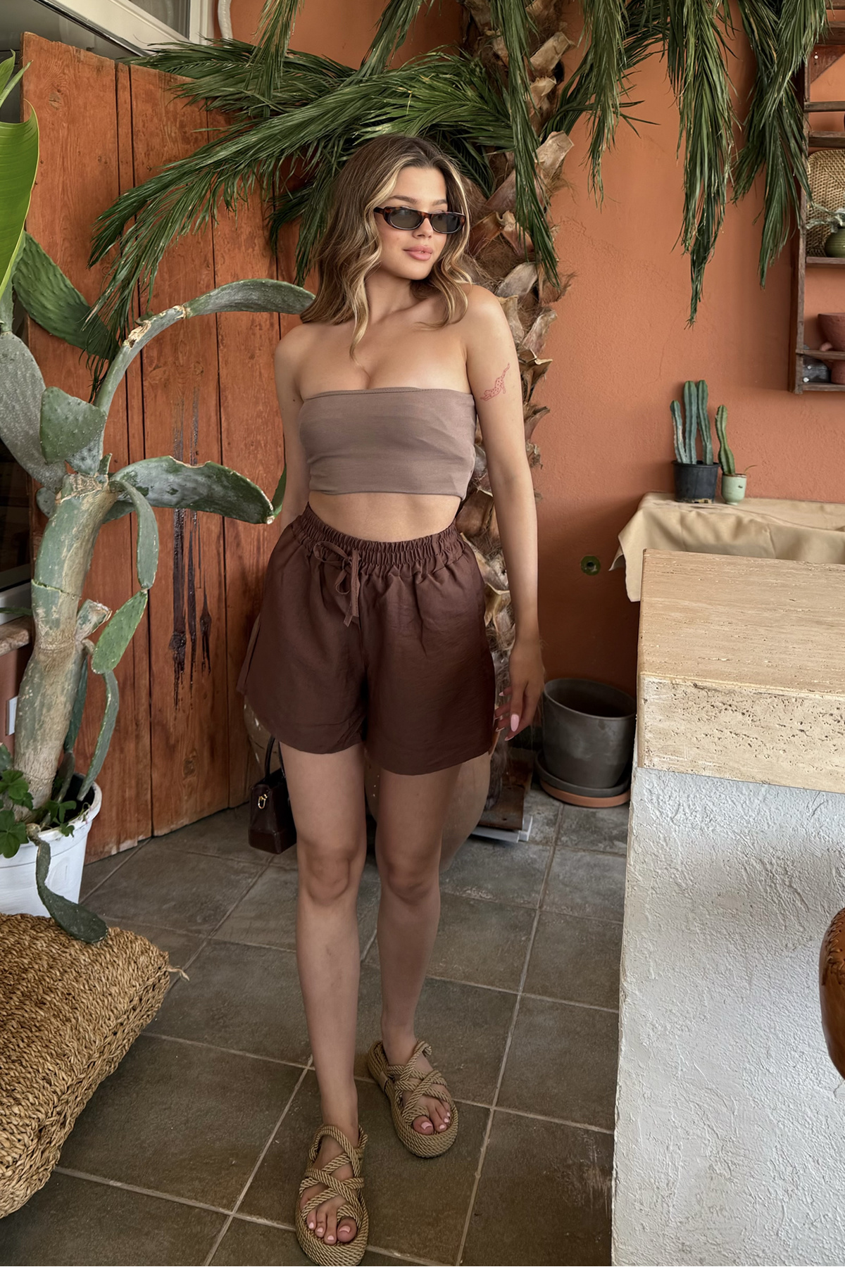 Kahverengi Keten Karışımlı Mini Şort Kahverengi Keten Karışımlı Mini Şort LABKKMS XL