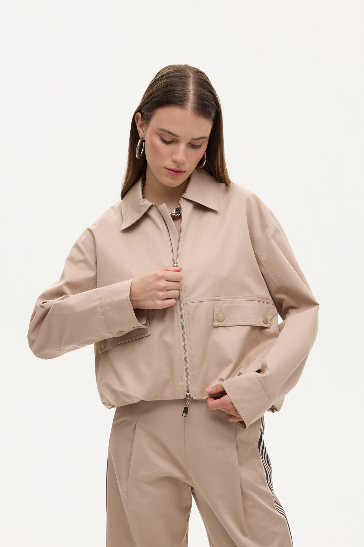 Sırtı Şeritli Gömlek Yaka Oversize Bomber Ceket Bej Sırtı Şeritli Gömlek Yaka Oversize Bomber Ceket Bej 26KCKT00977 L