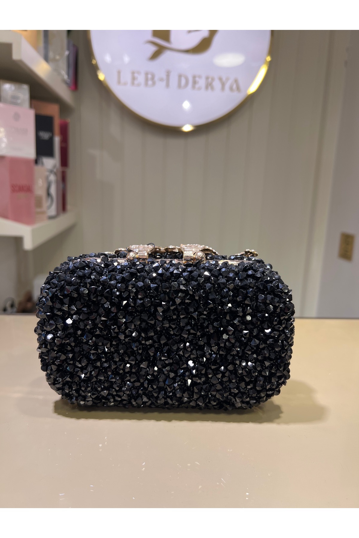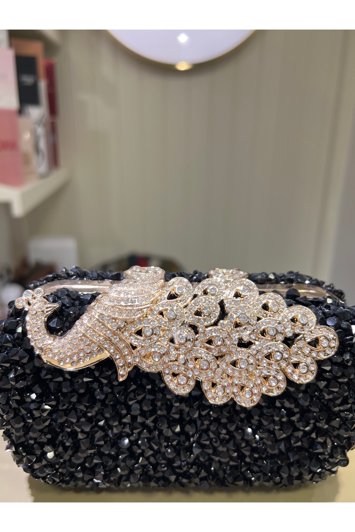 Tavuskuşu desenli siyah taşlı abiye çanta Tavuskuşu desenli siyah taşlı abiye çanta LD109 تک سایز