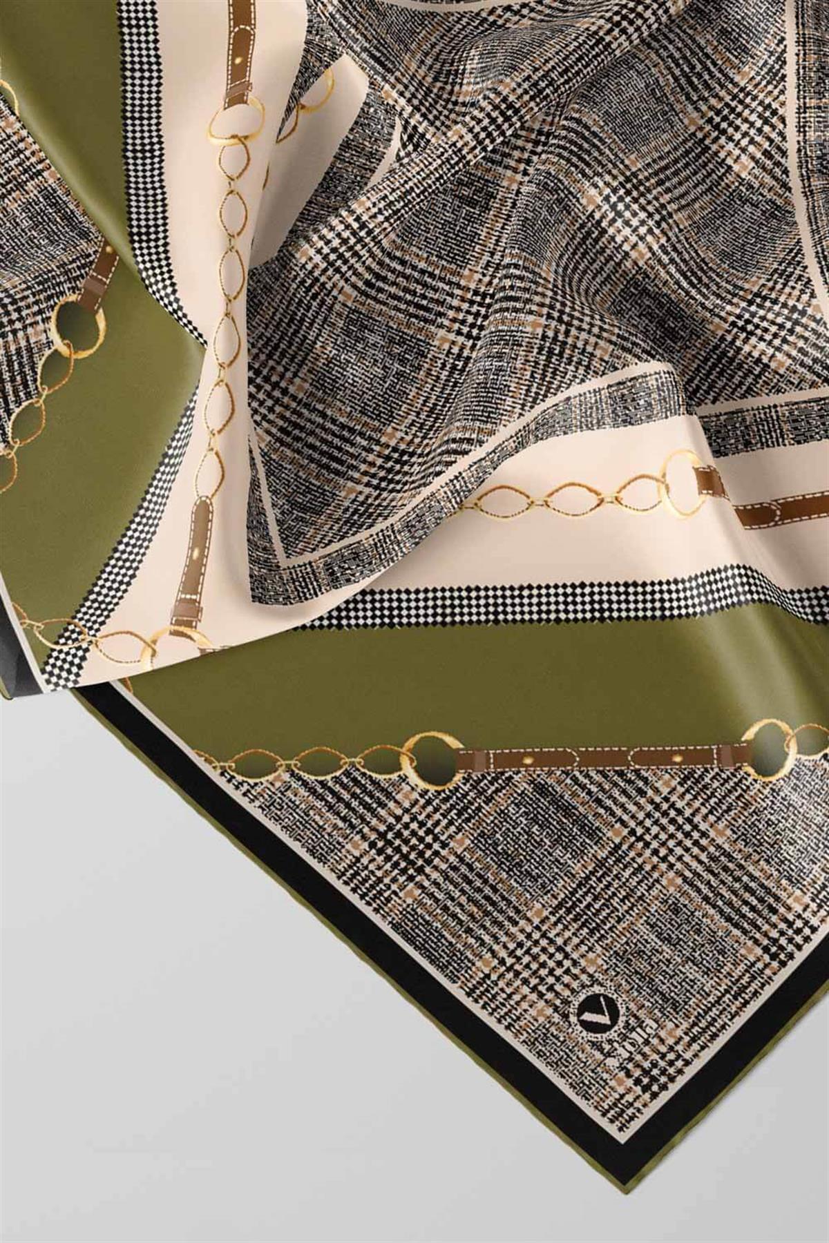 Twill Kemer ve Zincir Detaylı Ekose Desenli Haki Renkli 90x90 Eşarp (İpek İçermez) Kenar Dikiş Şekli Twill Kemer ve Zincir Detaylı Ekose Desenli Haki Renkli 90x90 Eşarp (İpek İçermez) Kenar Dikiş Şekli 7376-8 تک سایز