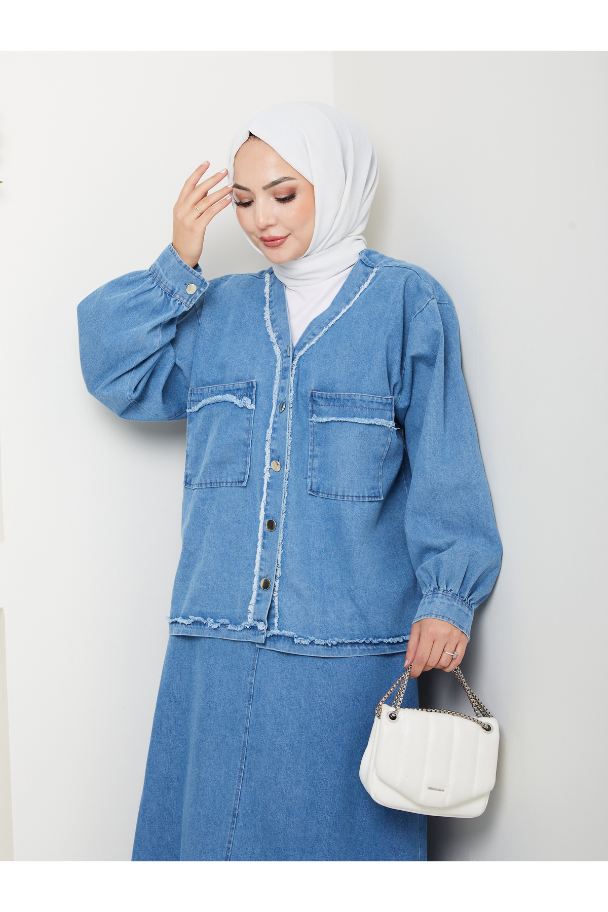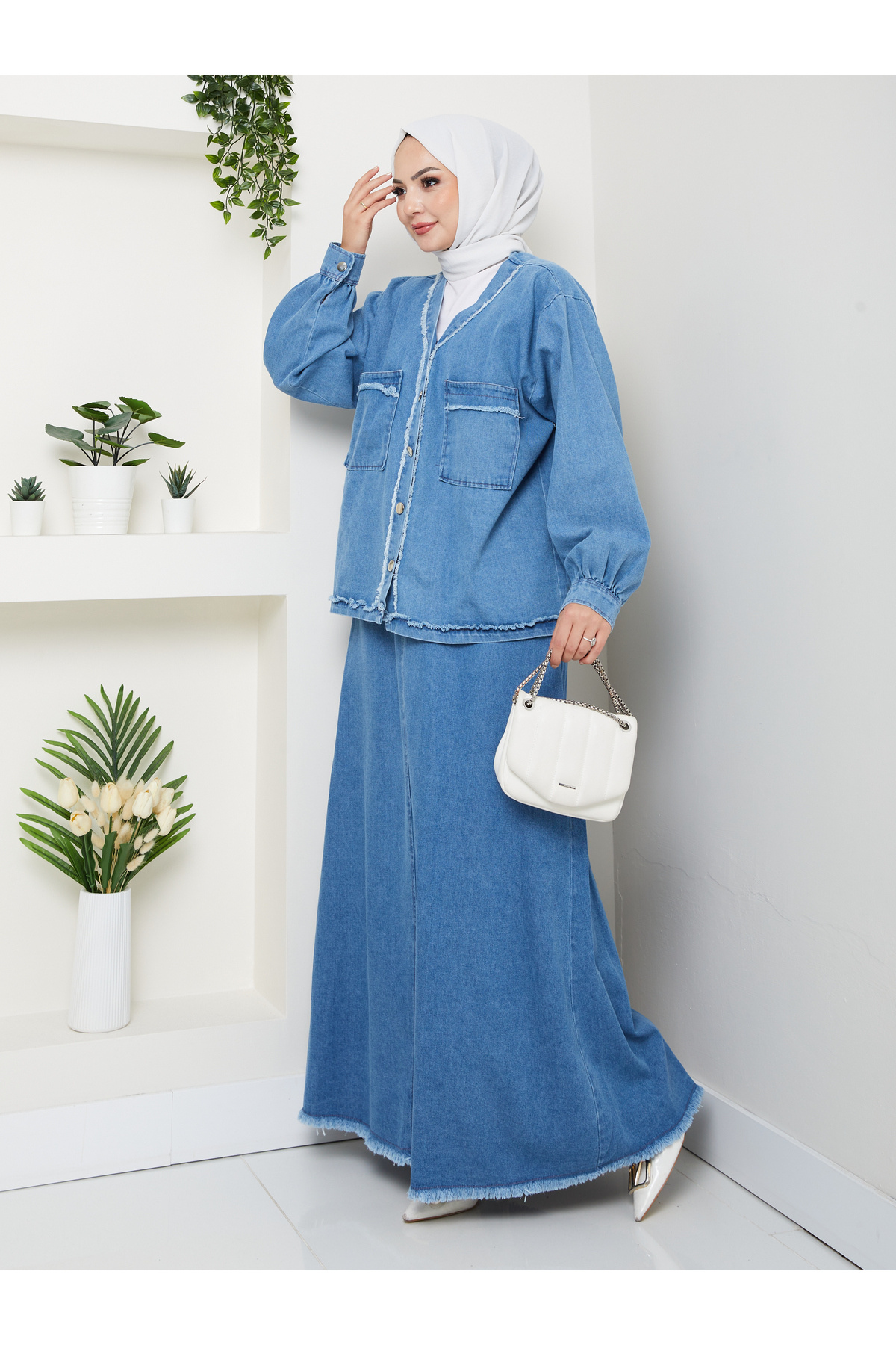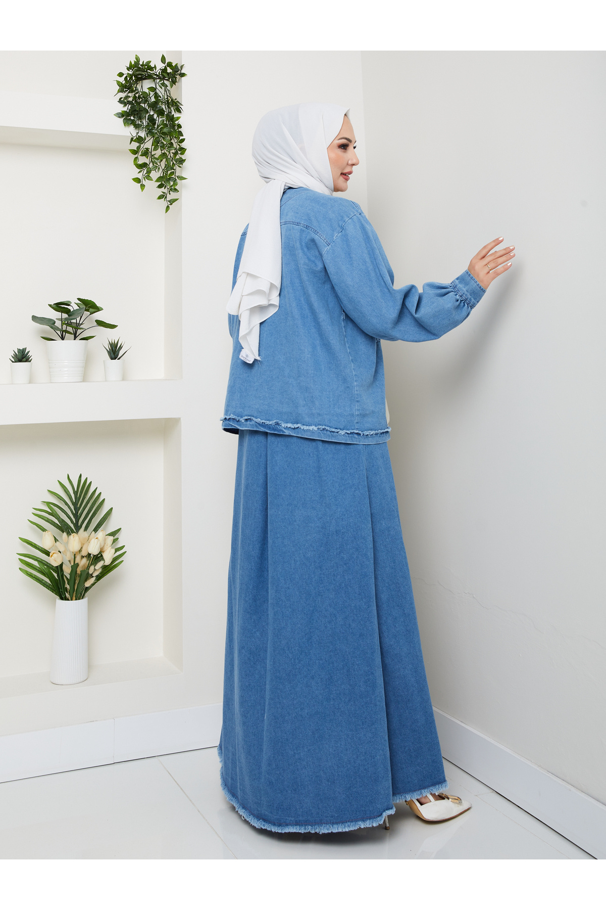 CEKETLI SAÇAKLI DETAYLİ AÇIK KOT TESETTÜR ETEKLİ TAKIM KOT KUMAŞ CEKETLI SAÇAKLI DETAYLİ AÇIK KOT TESETTÜR ETEKLİ TAKIM KOT KUMAŞ 905 48