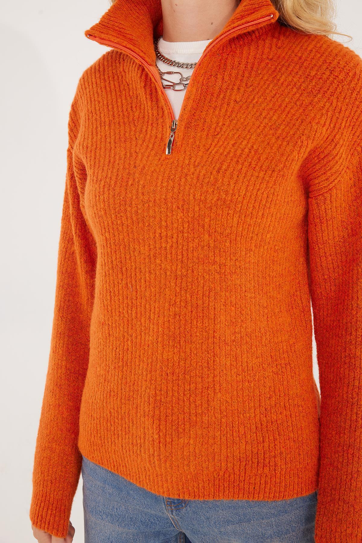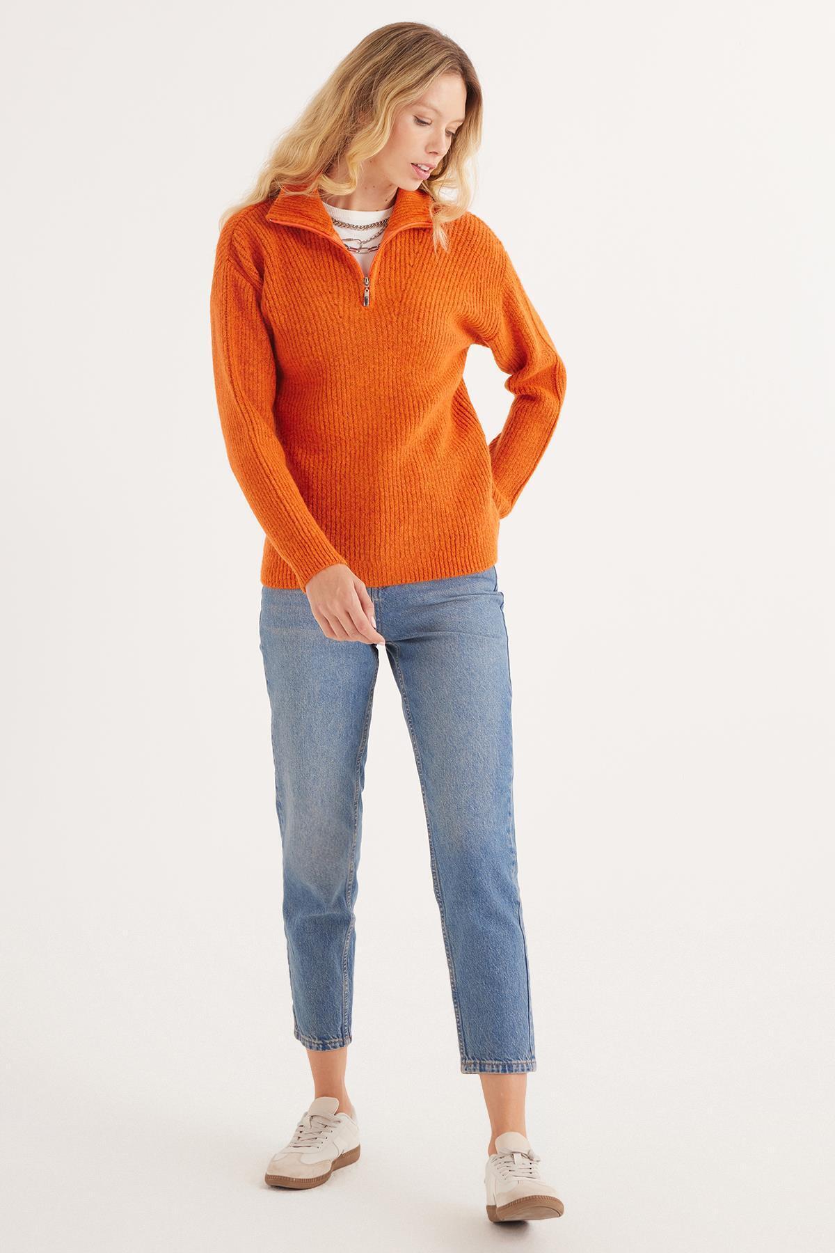 Kadın Oversize Geniş Kesim Dokumalı Fermuarlı Yaka Kiremit Kazak Kadın Oversize Geniş Kesim Dokumalı Fermuarlı Yaka Kiremit Kazak BYKZ2512 Standart