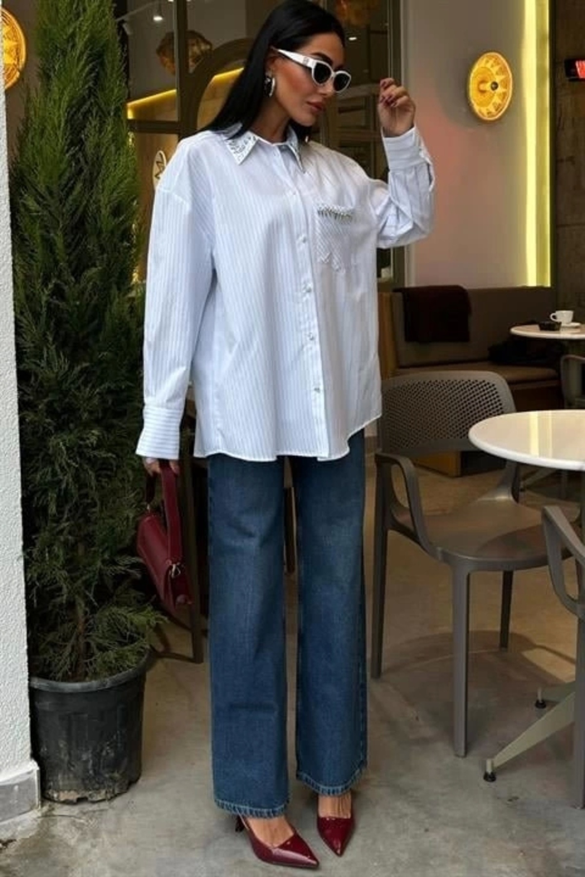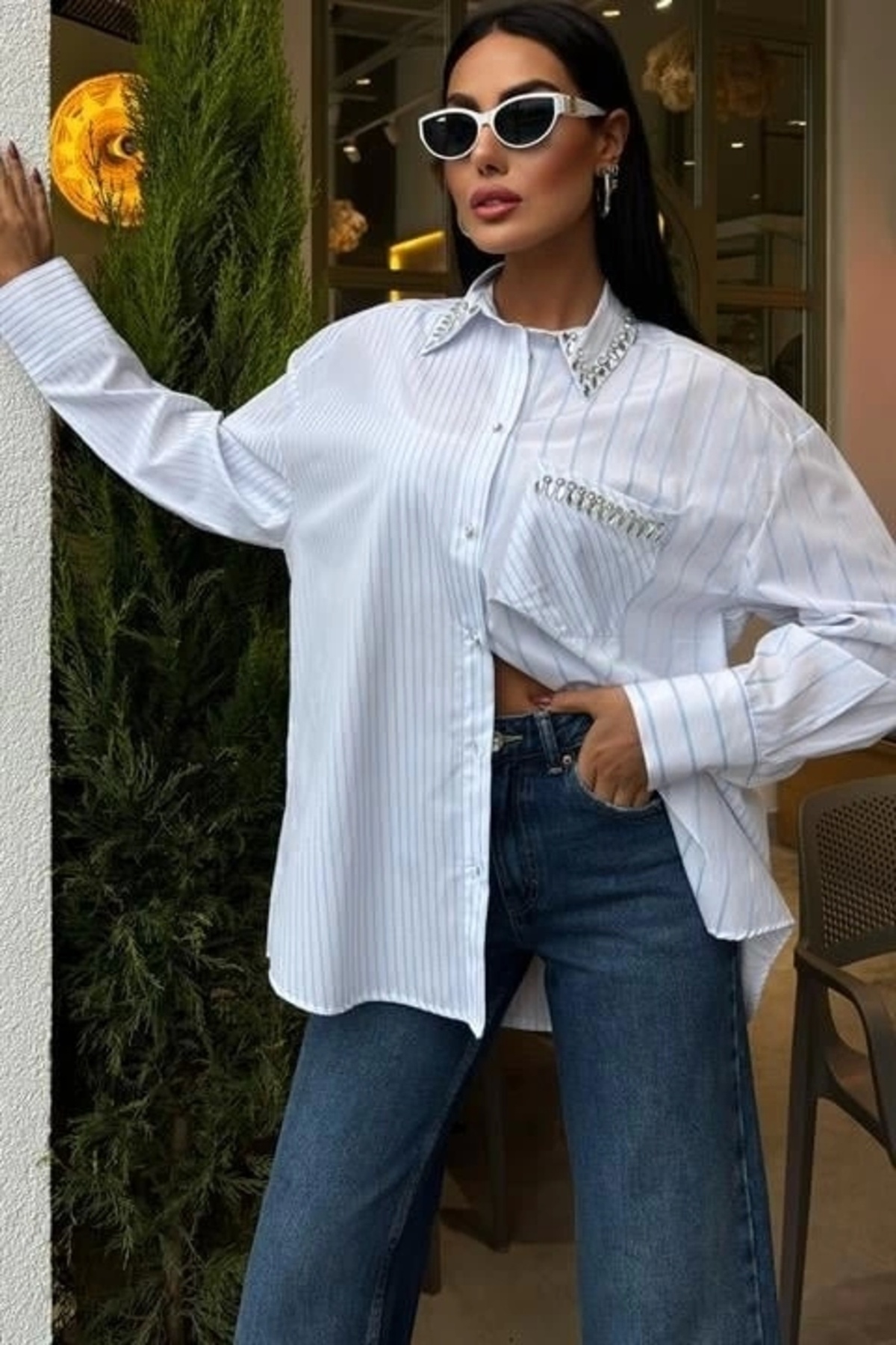 Yaka Ve Cebi Taşlı Çizgili Over Gömlek 3406 Yaka Ve Cebi Taşlı Çizgili Over Gömlek 3406 S5Y3406 XL