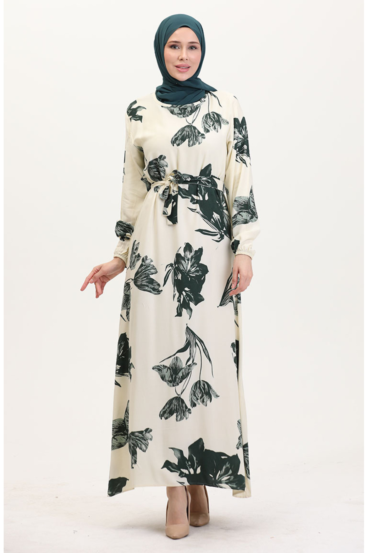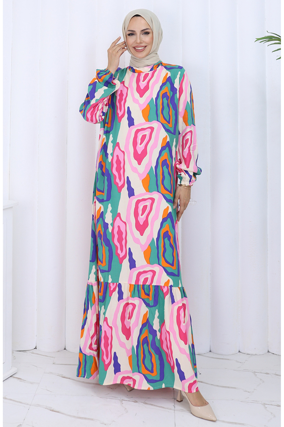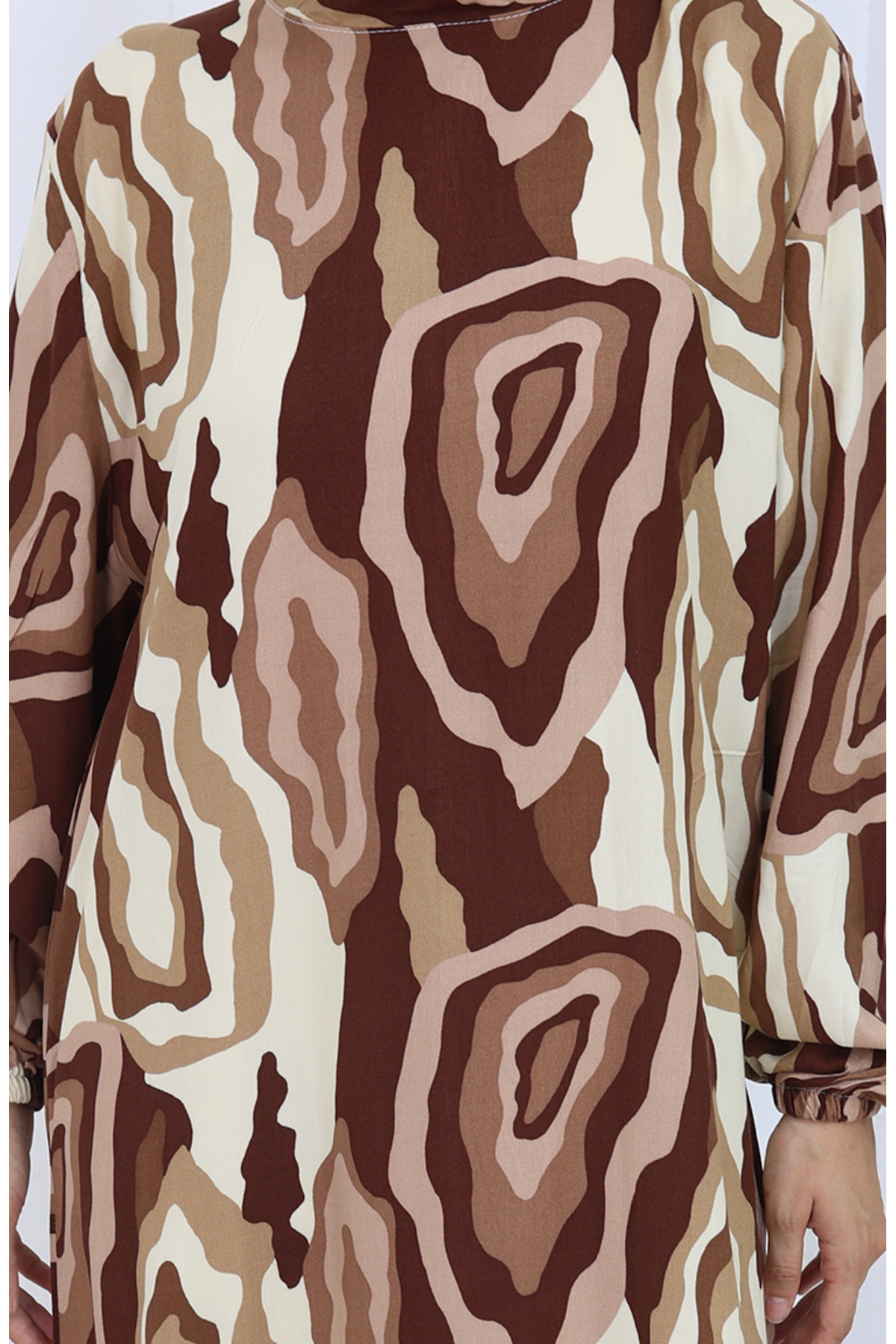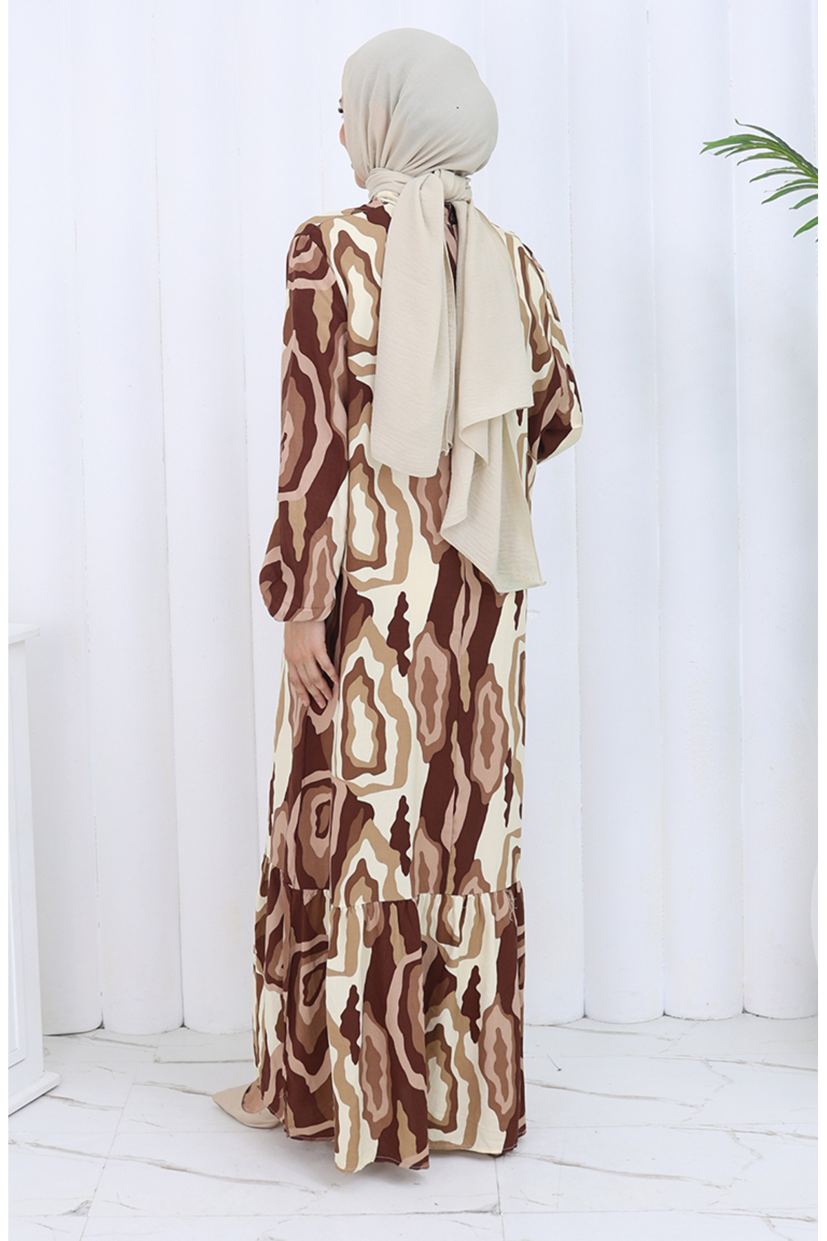 Kolu Lastikli Desenli Elbise 2122-01 Kahverengi Bej Kolu Lastikli Desenli Elbise 2122-01 Kahverengi Bej ZEMHERİ2122 50-52