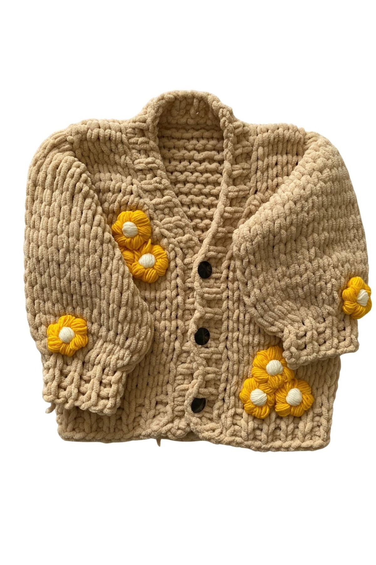 El Yapımı Kalın Örgü Çocuk Hırkası, Bej Renk, Sarı Çiçek Detaylı El Yapımı Kalın Örgü Çocuk Hırkası, Bej Renk, Sarı Çiçek Detaylı EKİNO çocuk yeleği 5 Yaş