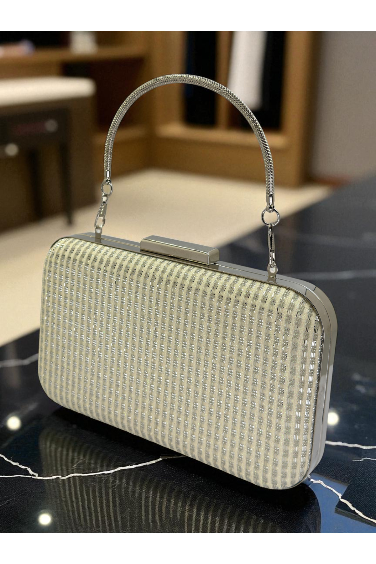 Tel Kırma Abiye Çanta – Beyaz, Gold Detaylı, Zincirli, 15×22 cm Tel Kırma Abiye Çanta – Beyaz, Gold Detaylı, Zincirli, 15×22 cm R19082025 تک سایز