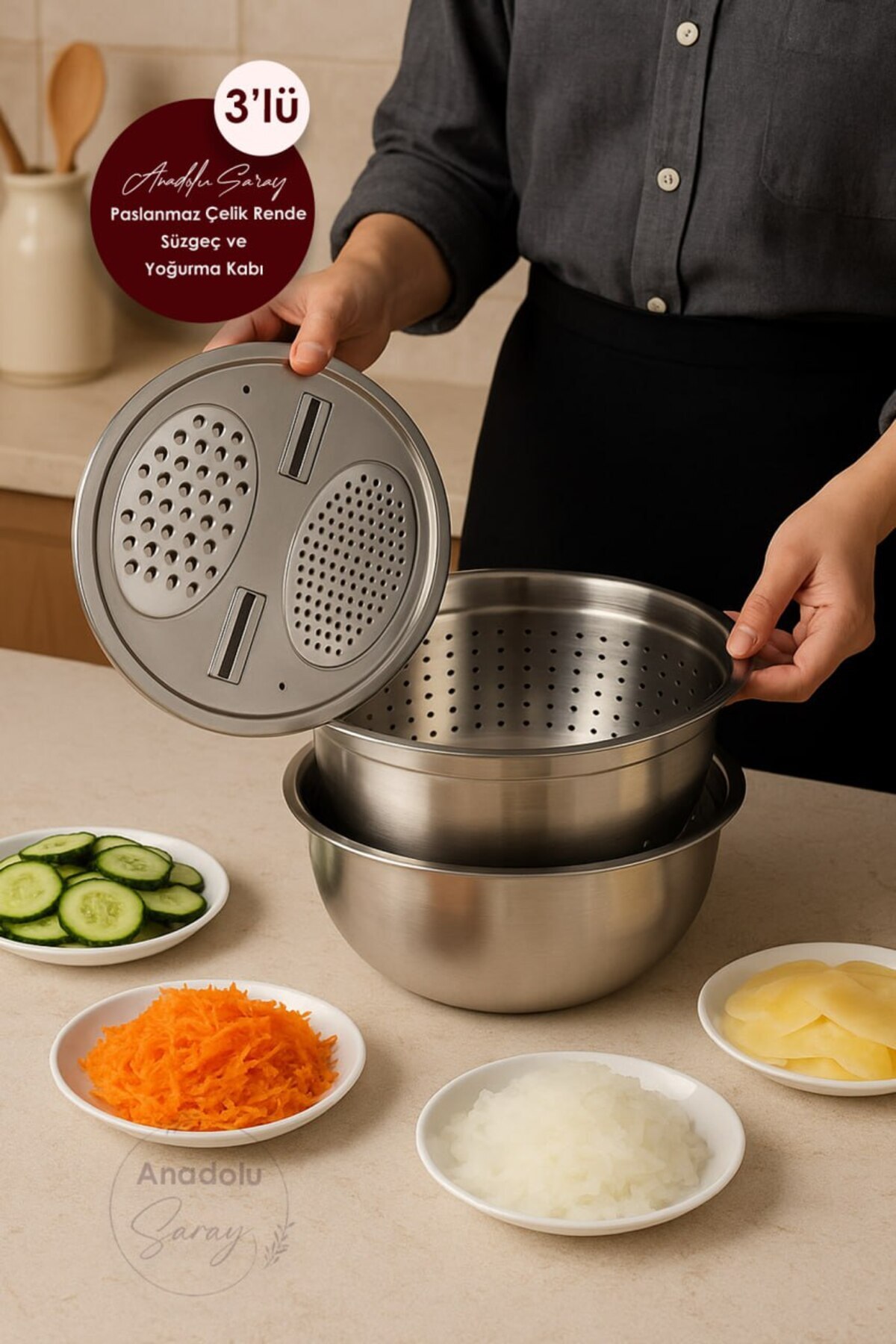 3lü Set Çok Fonksiyonlu Paslanmaz Çelik Rende, Süzgeç ve Yoğurma Kabı 3lü Set Çok Fonksiyonlu Paslanmaz Çelik Rende, Süzgeç ve Yoğurma Kabı YONLU.SUZGEC.KASE تک سایز