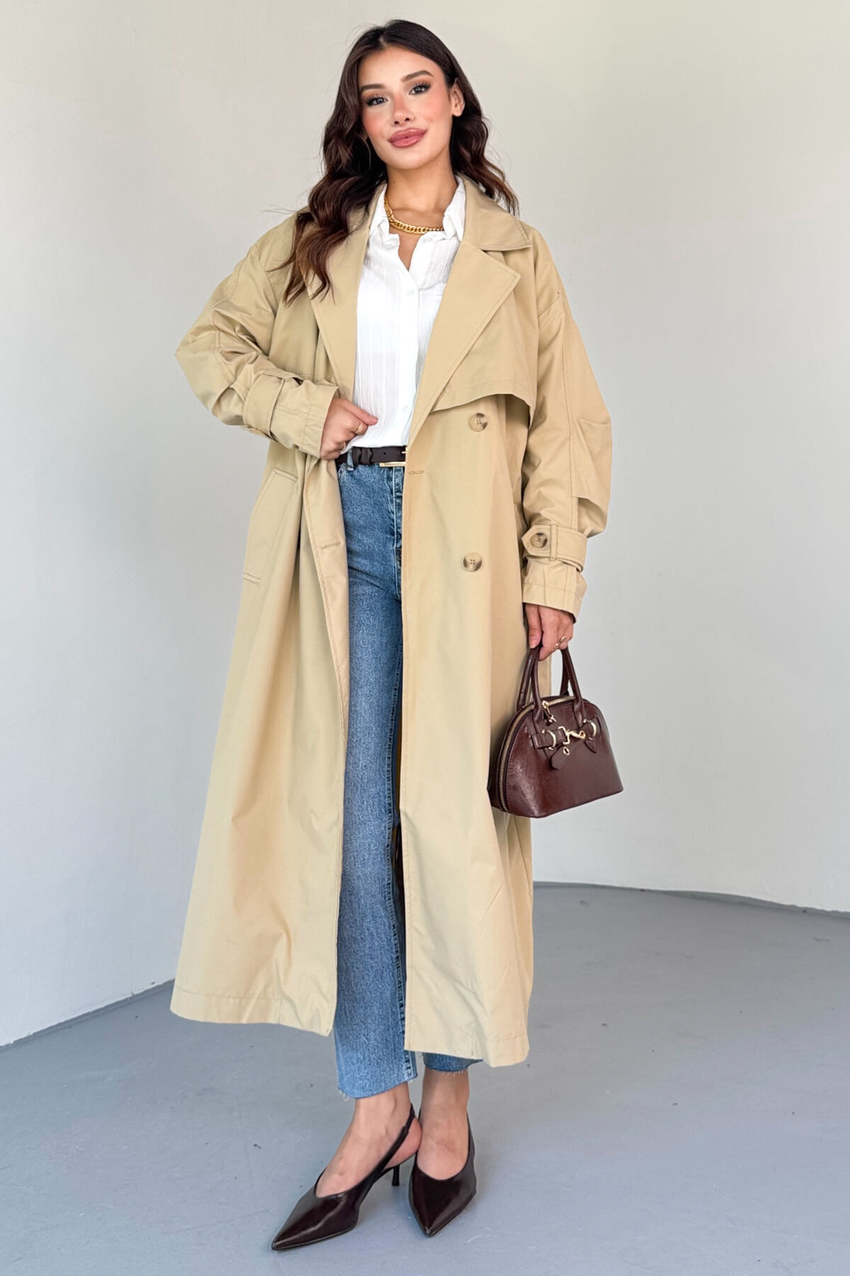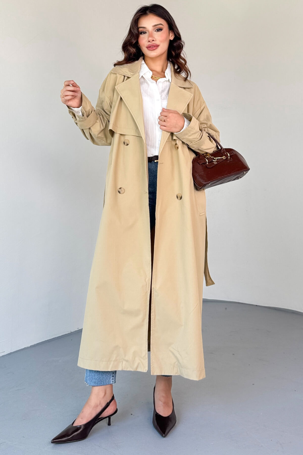 CKT-12450 Krem Kuşaklı Ön Düğmeli Uzun Trençkot CKT-12450 Krem Kuşaklı Ön Düğmeli Uzun Trençkot تک سایز