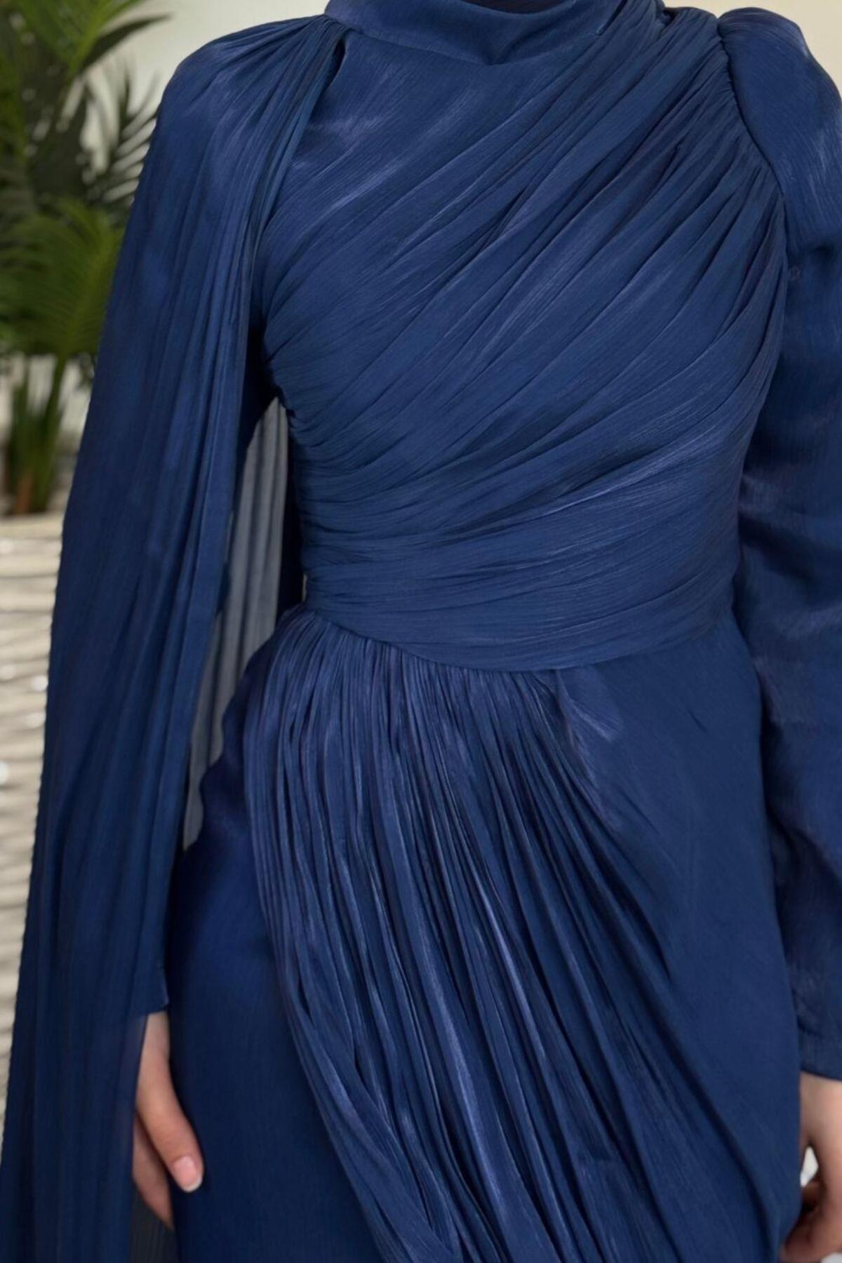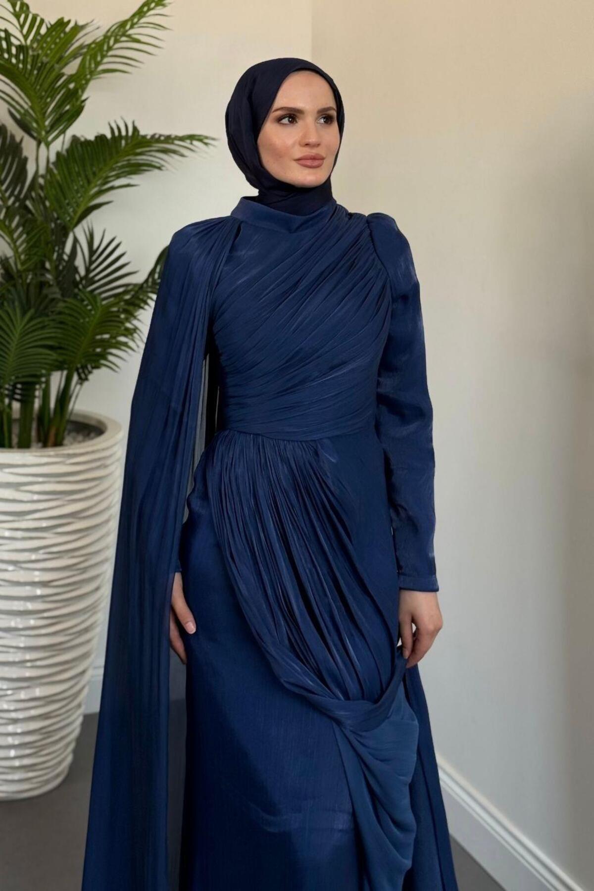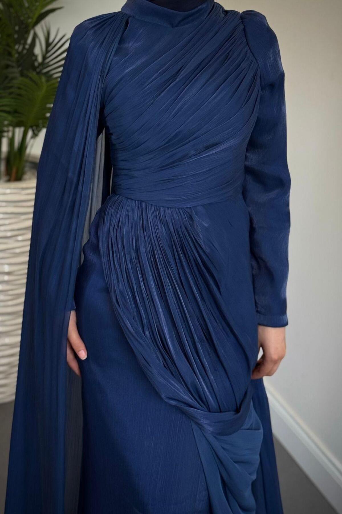 Rosalinne Tek Omuz Pelerinli Drapeli Jan Jan Abiye Lacivert Rosalinne Tek Omuz Pelerinli Drapeli Jan Jan Abiye Lacivert 2637 44
