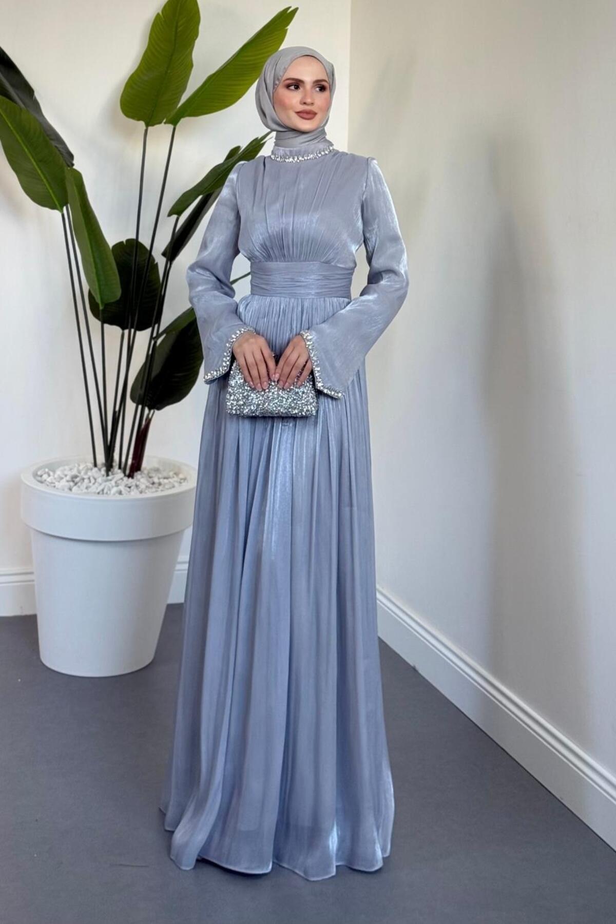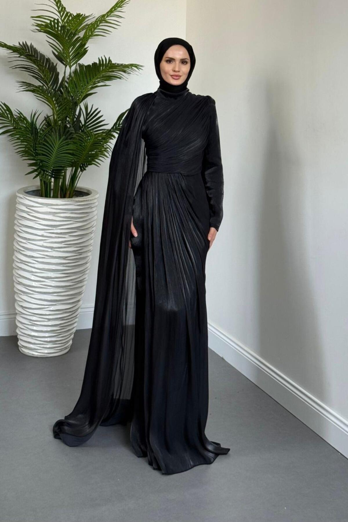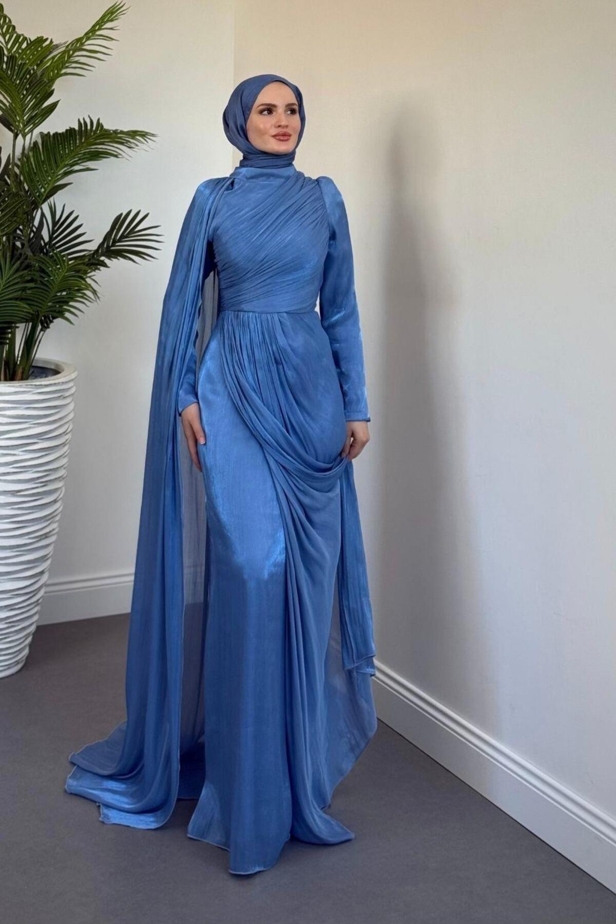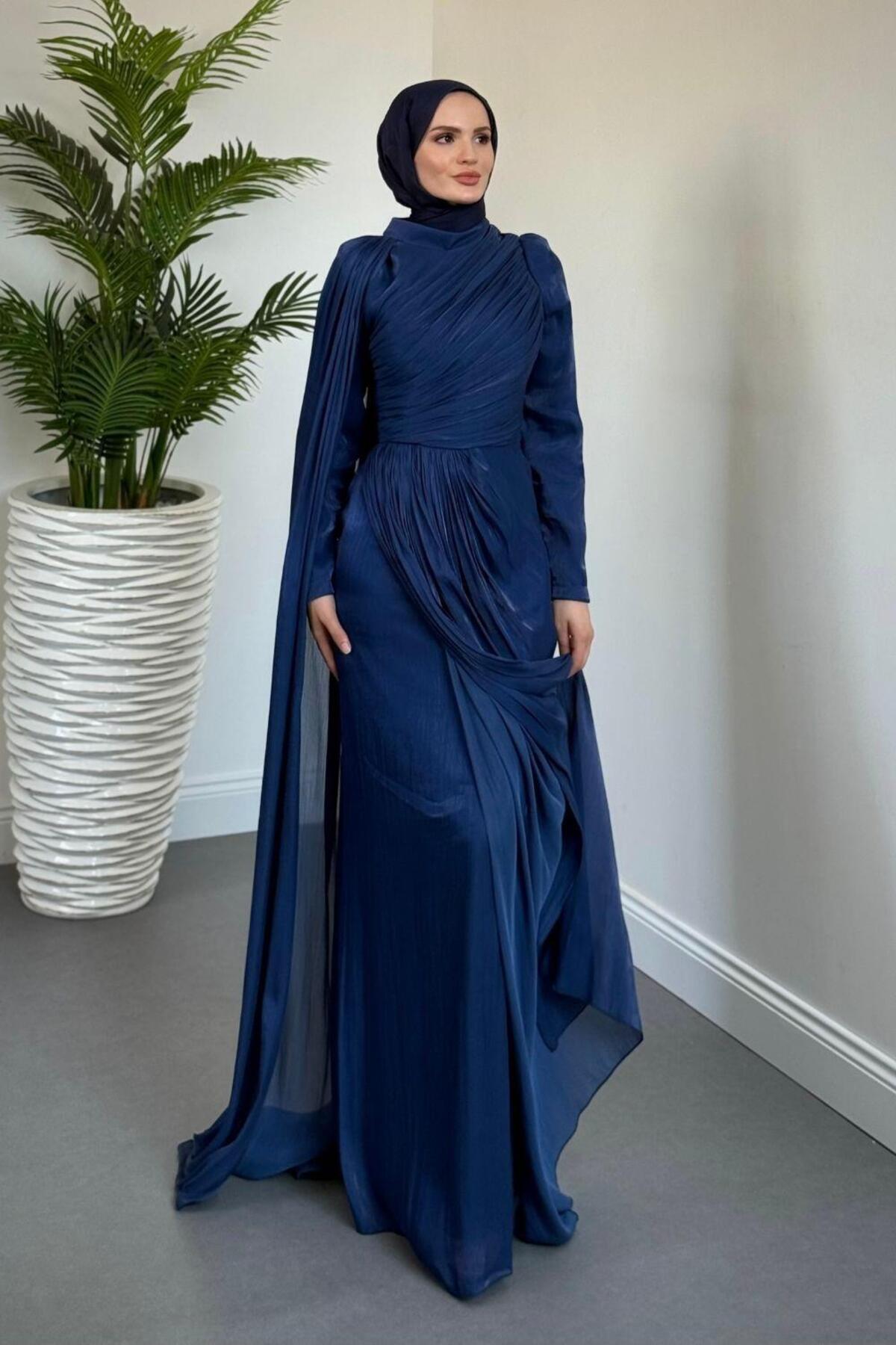 Rosalinne Tek Omuz Pelerinli Drapeli Jan Jan Abiye Lacivert Rosalinne Tek Omuz Pelerinli Drapeli Jan Jan Abiye Lacivert 2637 44