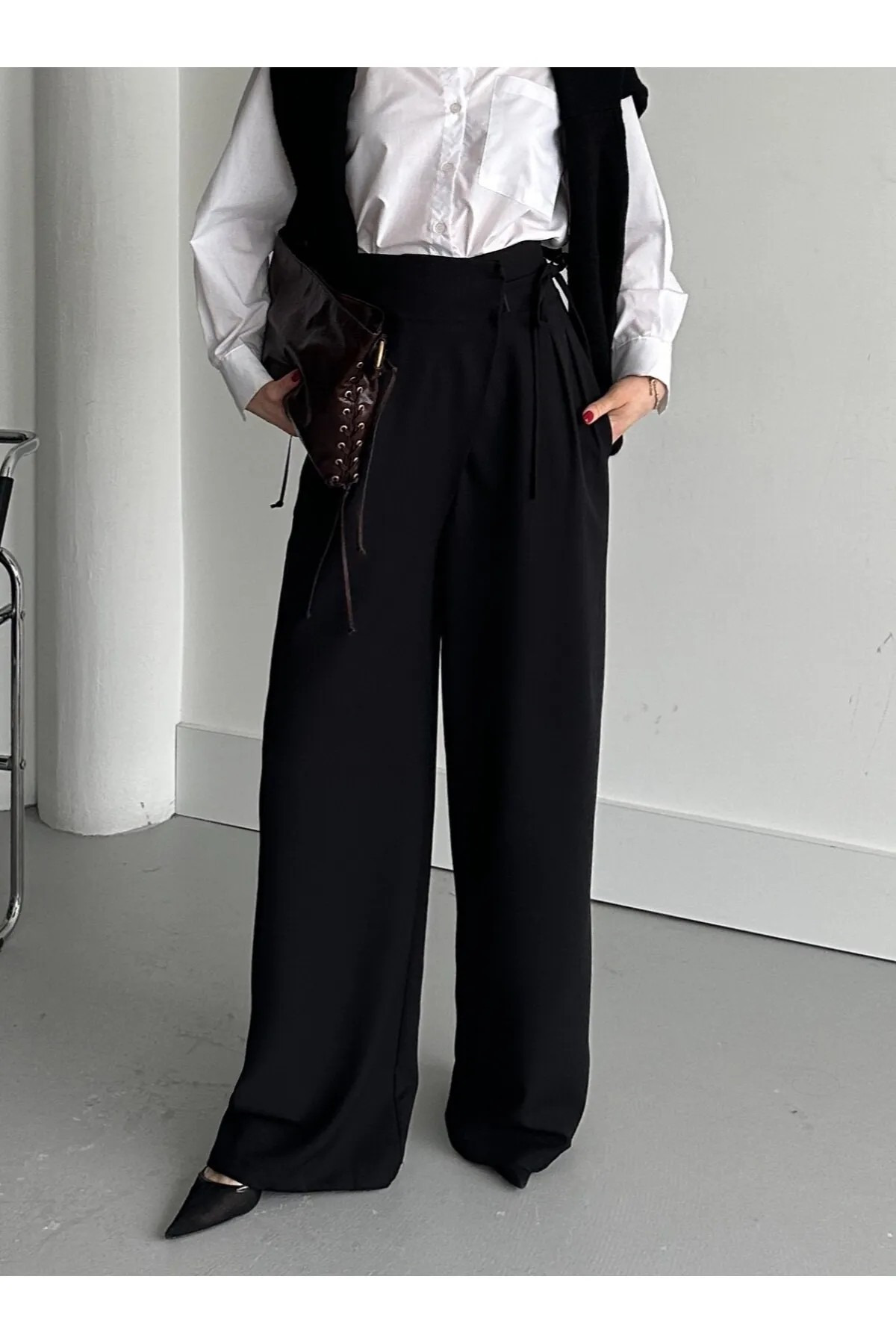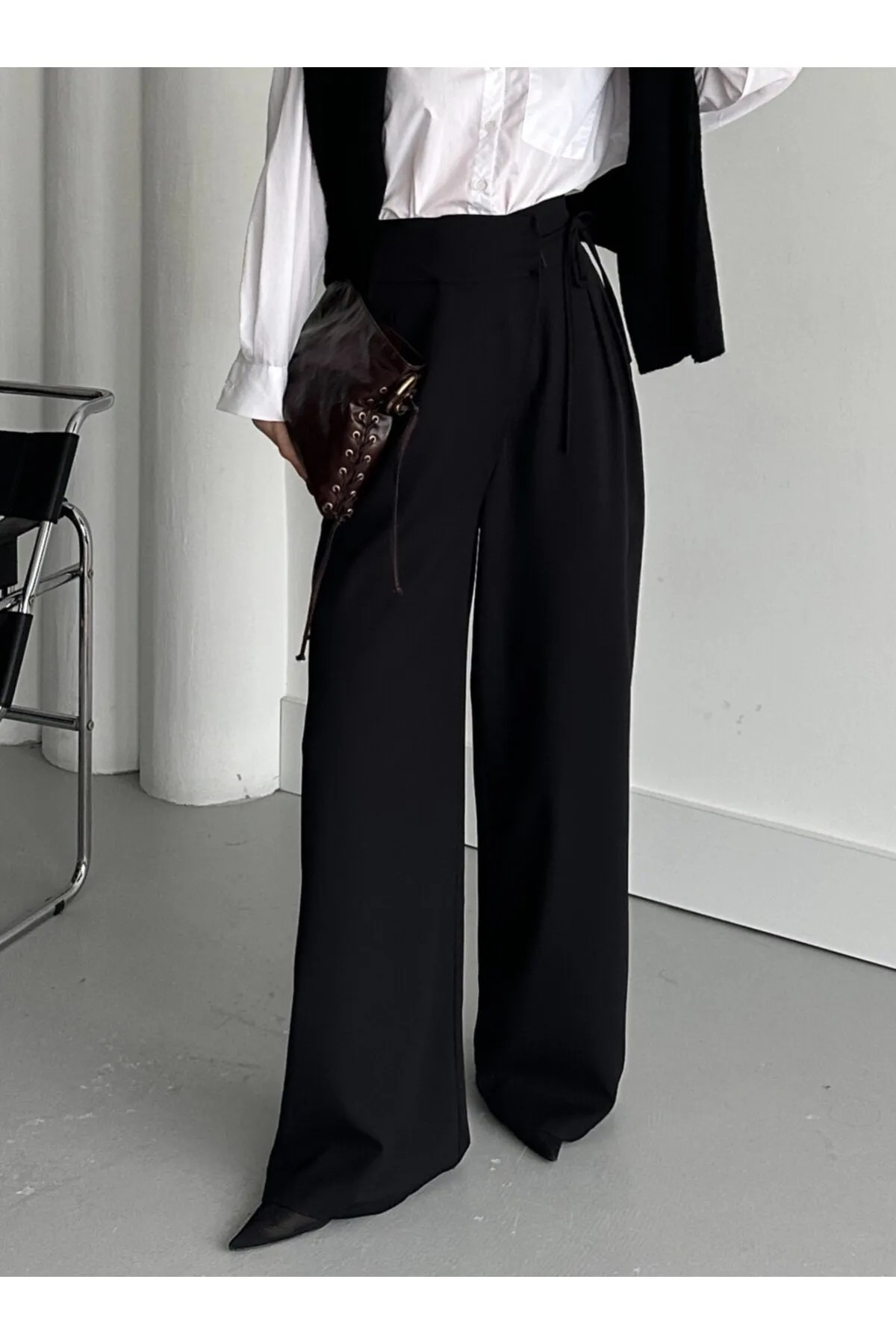 Siyah Yan Bağlama Detaylı Pantolon - 2402 Siyah Yan Bağlama Detaylı Pantolon - 2402 Qado - 2402 yan bağlama detaylı pantolon L