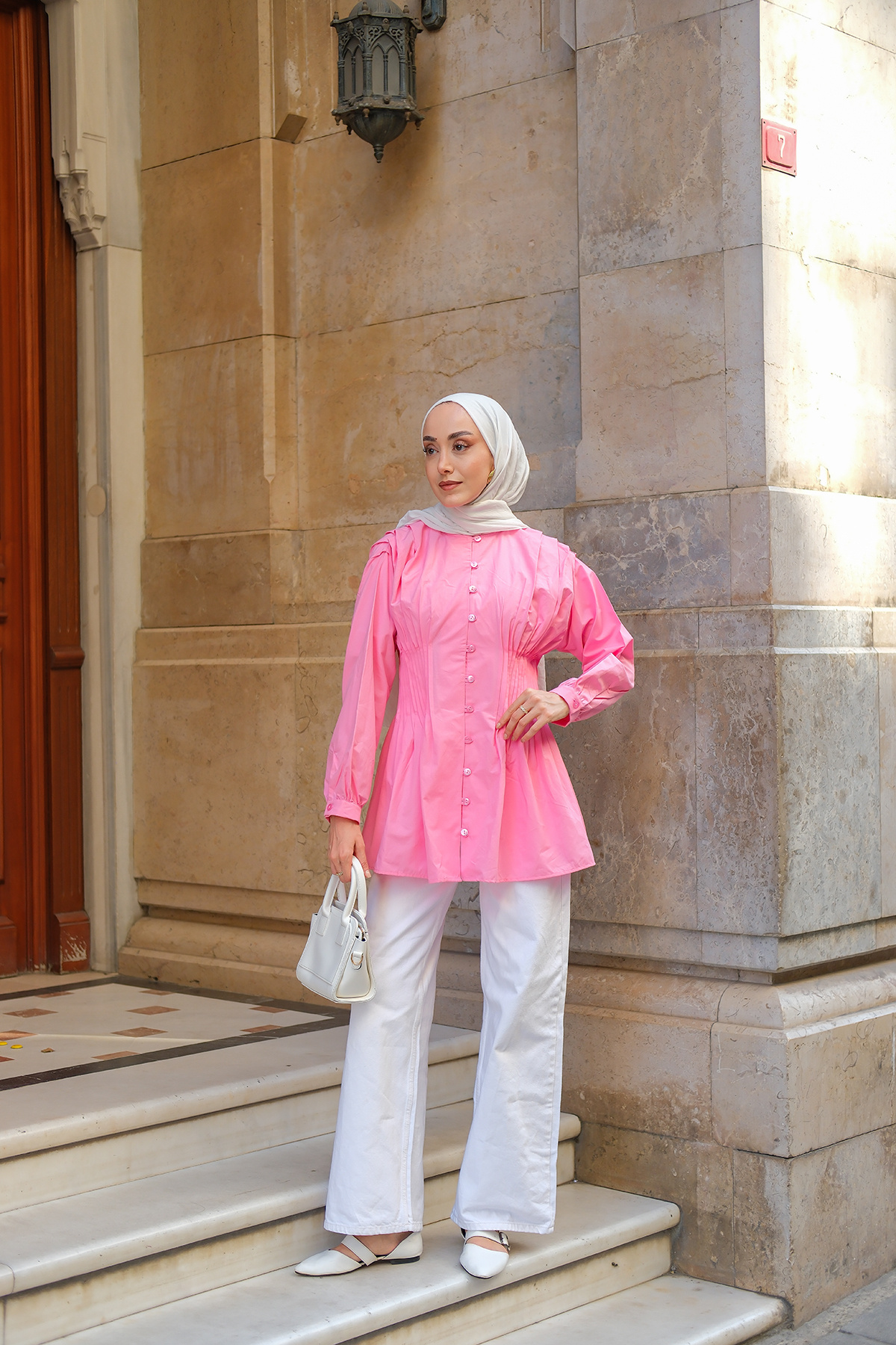 Kadın Beli Nervürlü Poplin Gömlek Pembe Kadın Beli Nervürlü Poplin Gömlek Pembe 182-214 L/XL