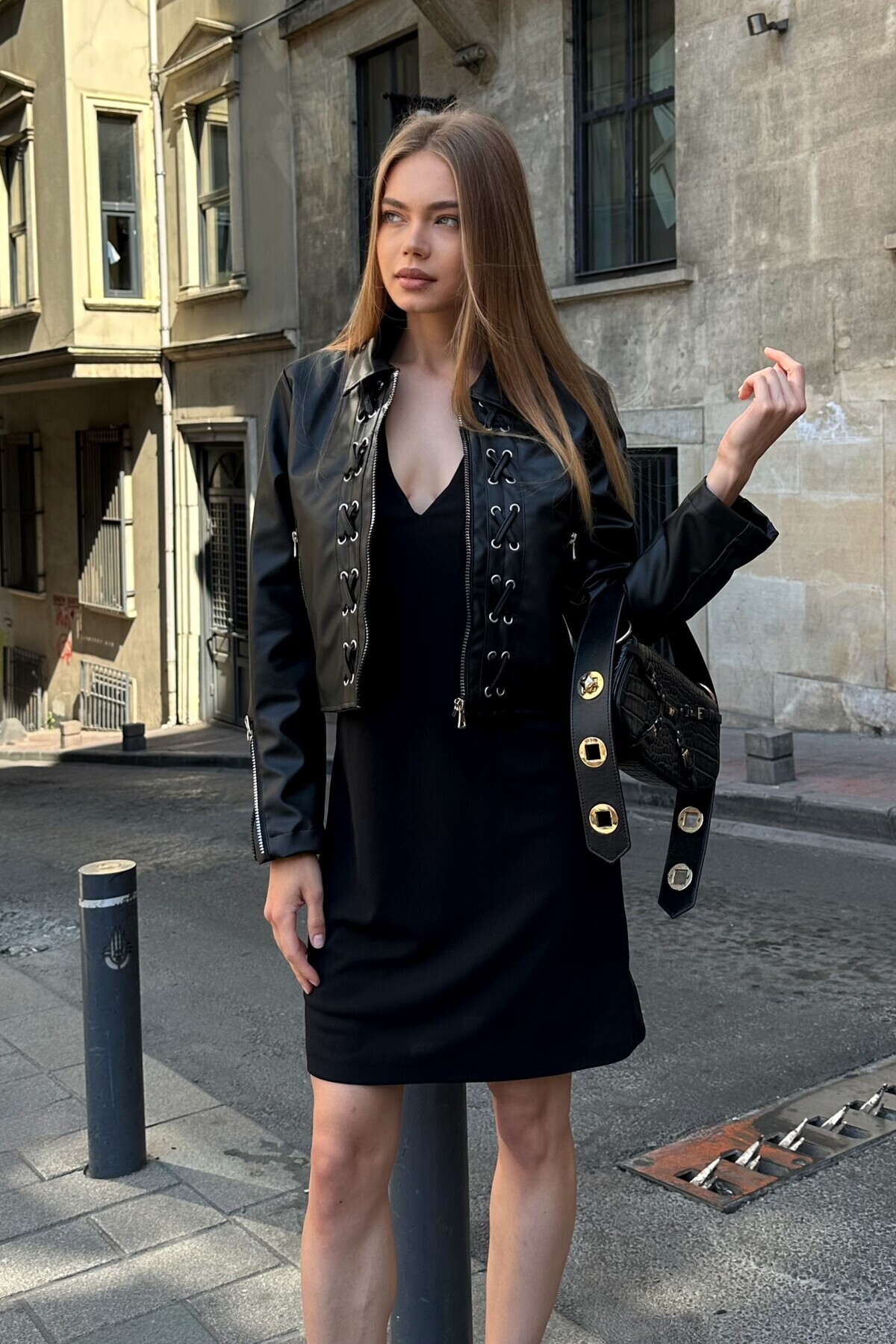 Kadın Siyah Crop Suni Deri Ceket - Fermuar ve Bağcık Detaylı Biker Style Kadın Siyah Crop Suni Deri Ceket - Fermuar ve Bağcık Detaylı Biker Style BMBRKLJCKT034 XL