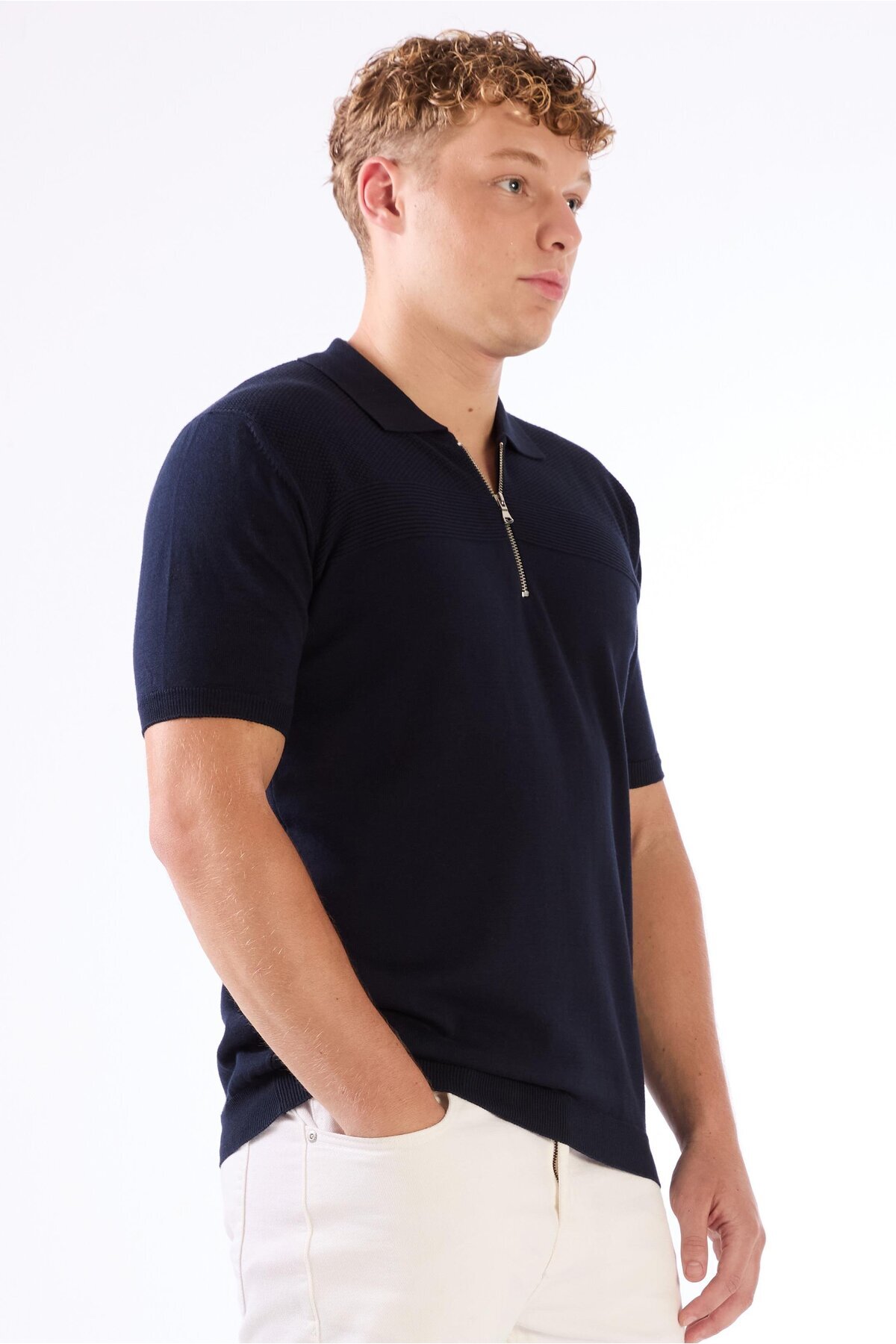 Lacivert Fermuarlı Polo Yaka Kısa Kollu Örgü Slim Fit Erkek Triko Lacivert Fermuarlı Polo Yaka Kısa Kollu Örgü Slim Fit Erkek Triko DU1252033009 2XL