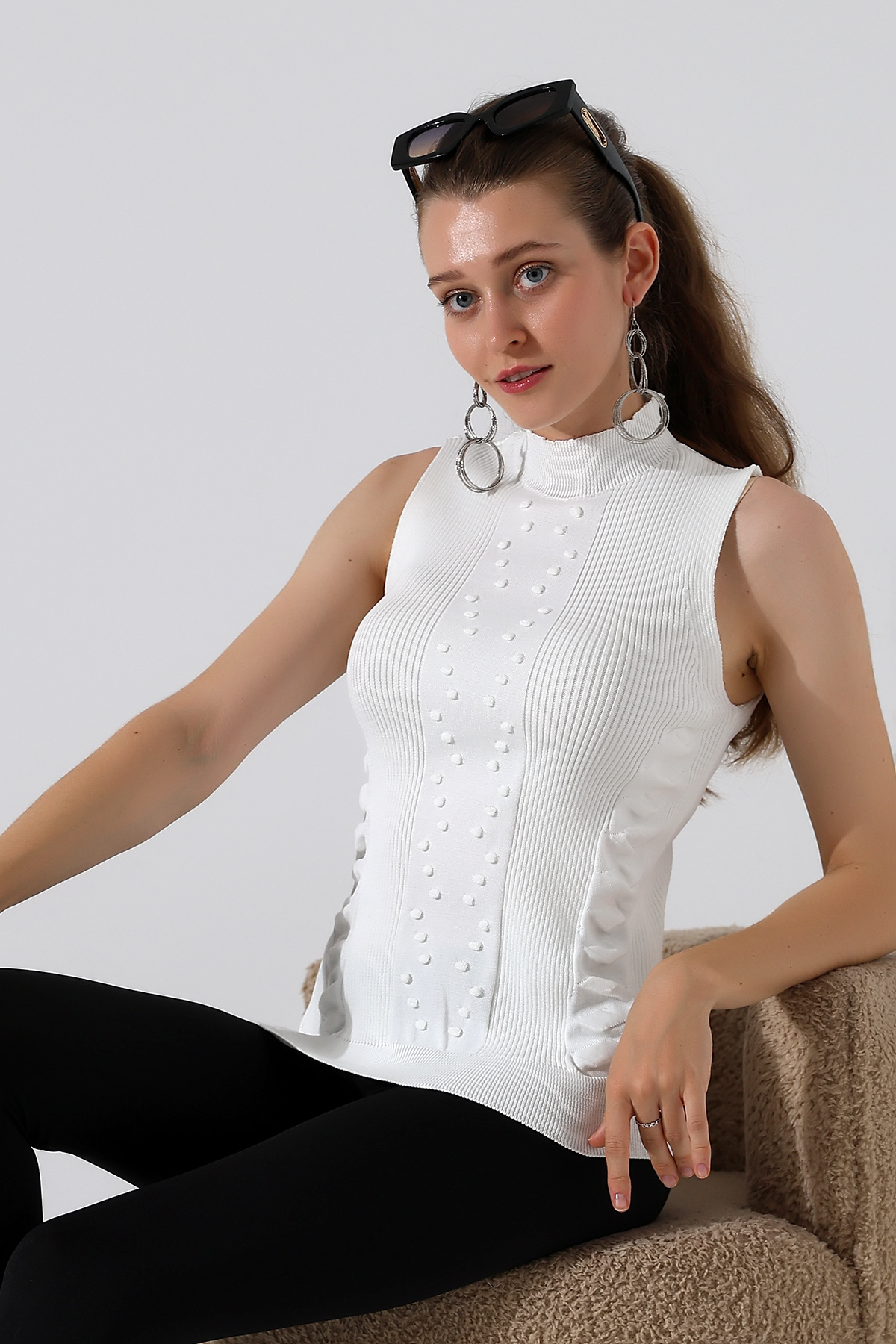 Yarım Balıkçı Dik Yaka Fitilli Kolsuz Çizgili Biriktirmeli Desenli Dokuma Detaylı Yazlık Triko Bluz Yarım Balıkçı Dik Yaka Fitilli Kolsuz Çizgili Biriktirmeli Desenli Dokuma Detaylı Yazlık Triko Bluz ALCH-00172 Standart