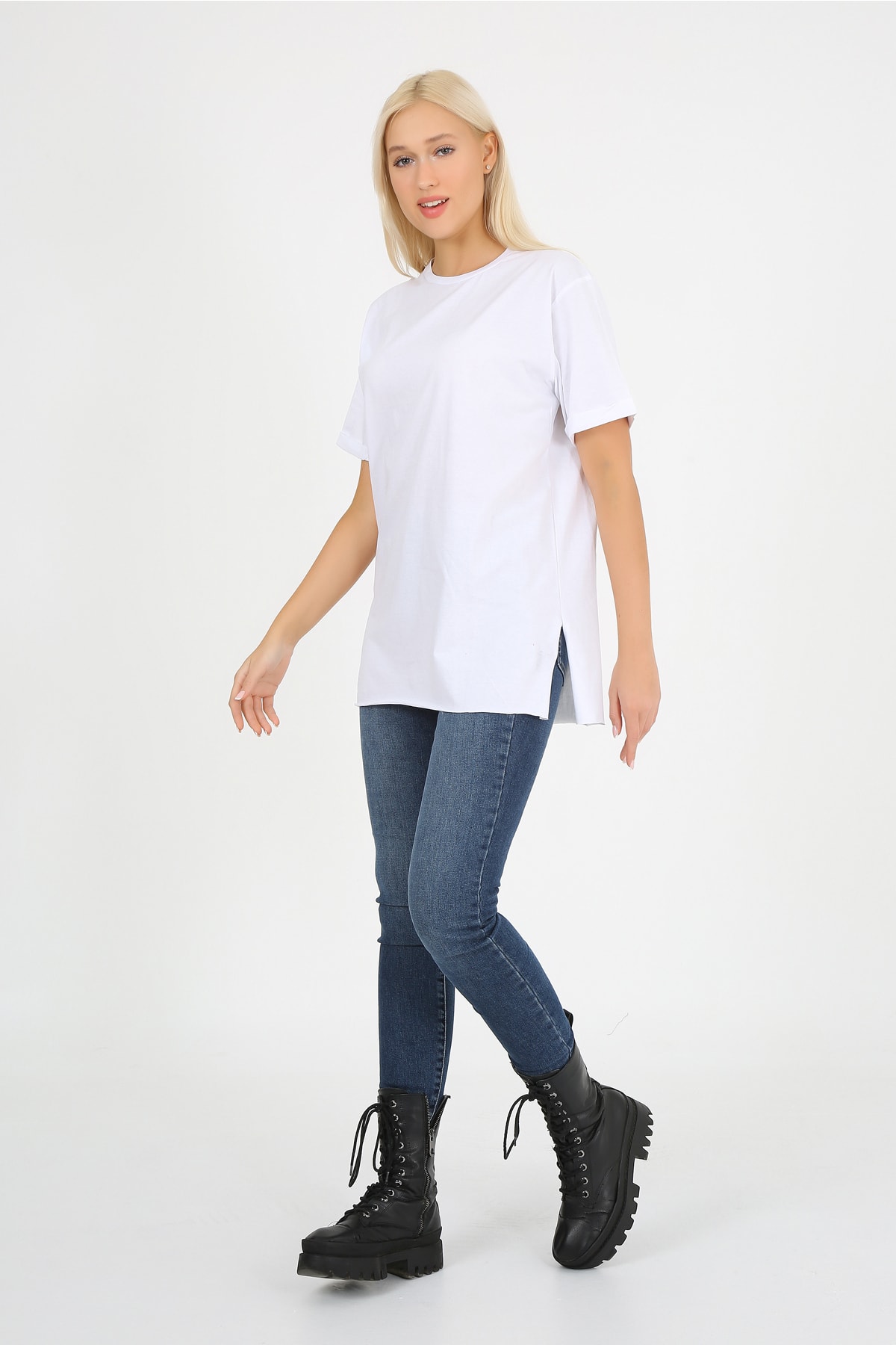 Bisiklet Yaka Düz Yarım Kollu Yırtmaç Detaylı Rahat Kesim Beyaz Oversize T-shirt-Tişört Bisiklet Yaka Düz Yarım Kollu Yırtmaç Detaylı Rahat Kesim Beyaz Oversize T-shirt-Tişört 96451677 XL