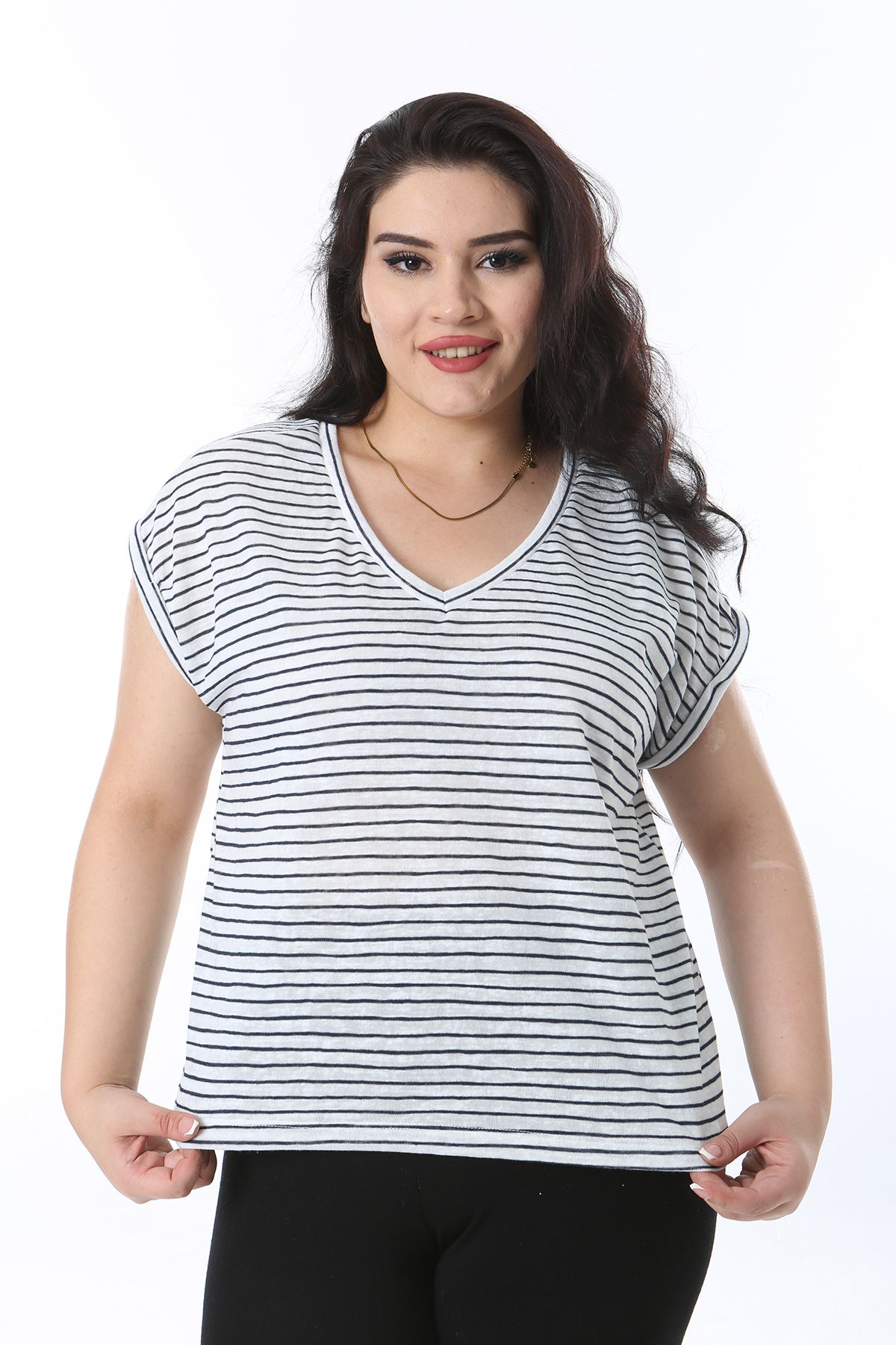 Kadın Büyük Beden Beyaz, Pamuklu Kumaş, V Yaka Çizgili Bluz 65N39094 Kadın Büyük Beden Beyaz, Pamuklu Kumaş, V Yaka Çizgili Bluz 65N39094 58-60